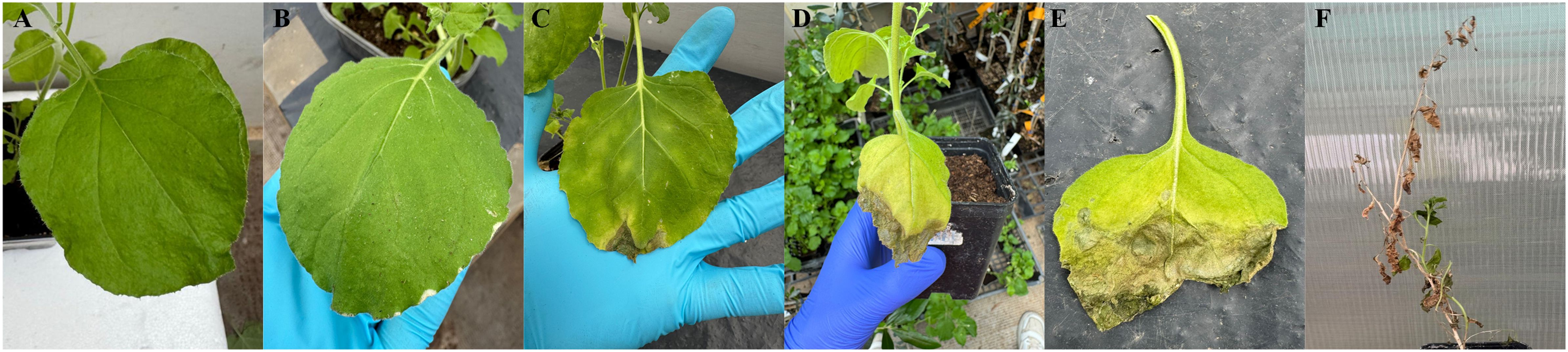 Figure 5. Progression of symptom severity on Nicotiana benthamiana leaves, illustrated according to a visual scale from 0 (no visible symptoms) to 5 (severe symptoms), panels (A–F), respectively.