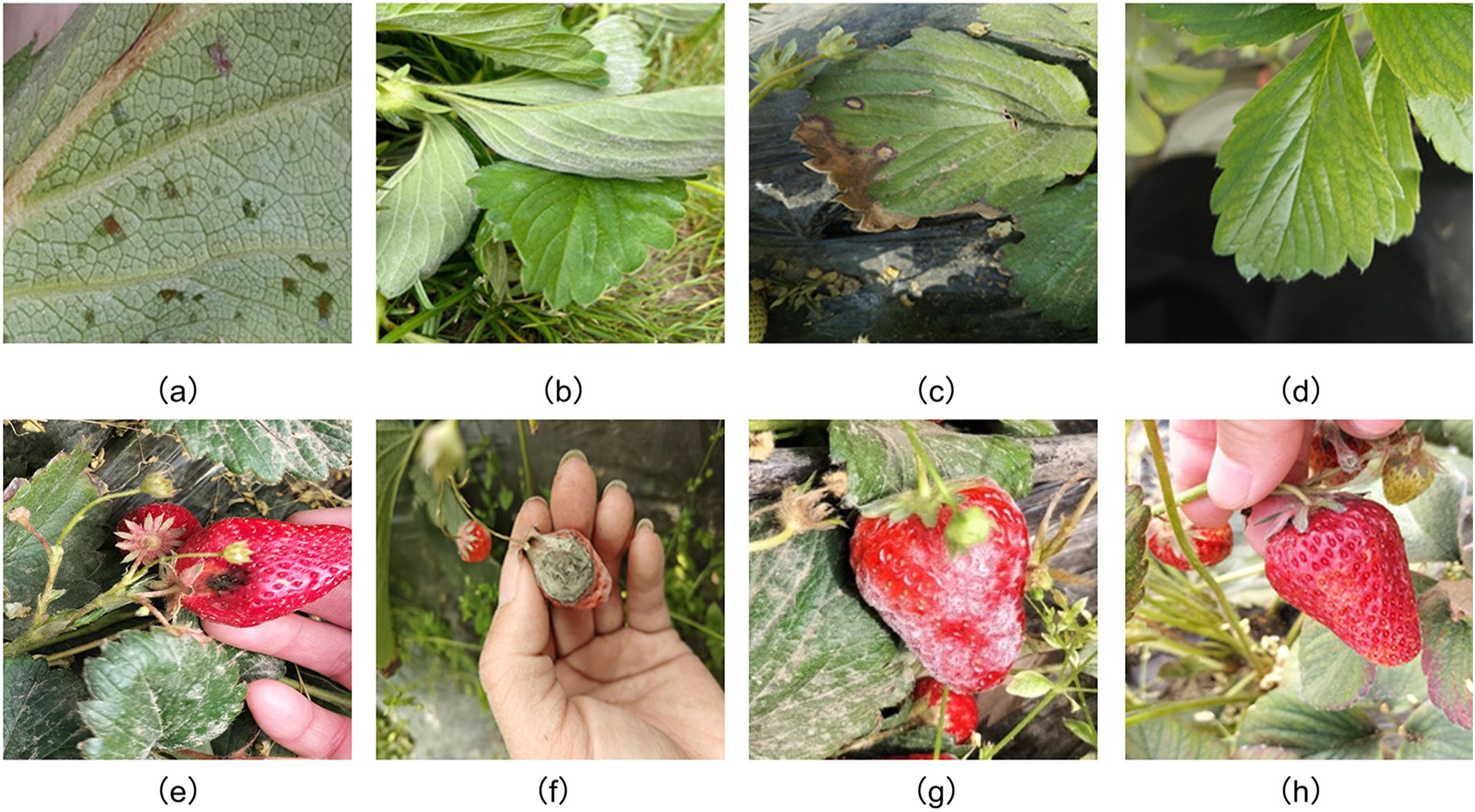 Figure 1. Healthy and diseased strawberry leaves and fruits (a) angular_leafspot (b) powdery_mildew_leaf (c) leaf_spot (d) healthy_leaf (e) anthracnose_fruit_rot (f) gray_mold (g) powdery_mildew_fruit (h) healthy_ripe_fruit.