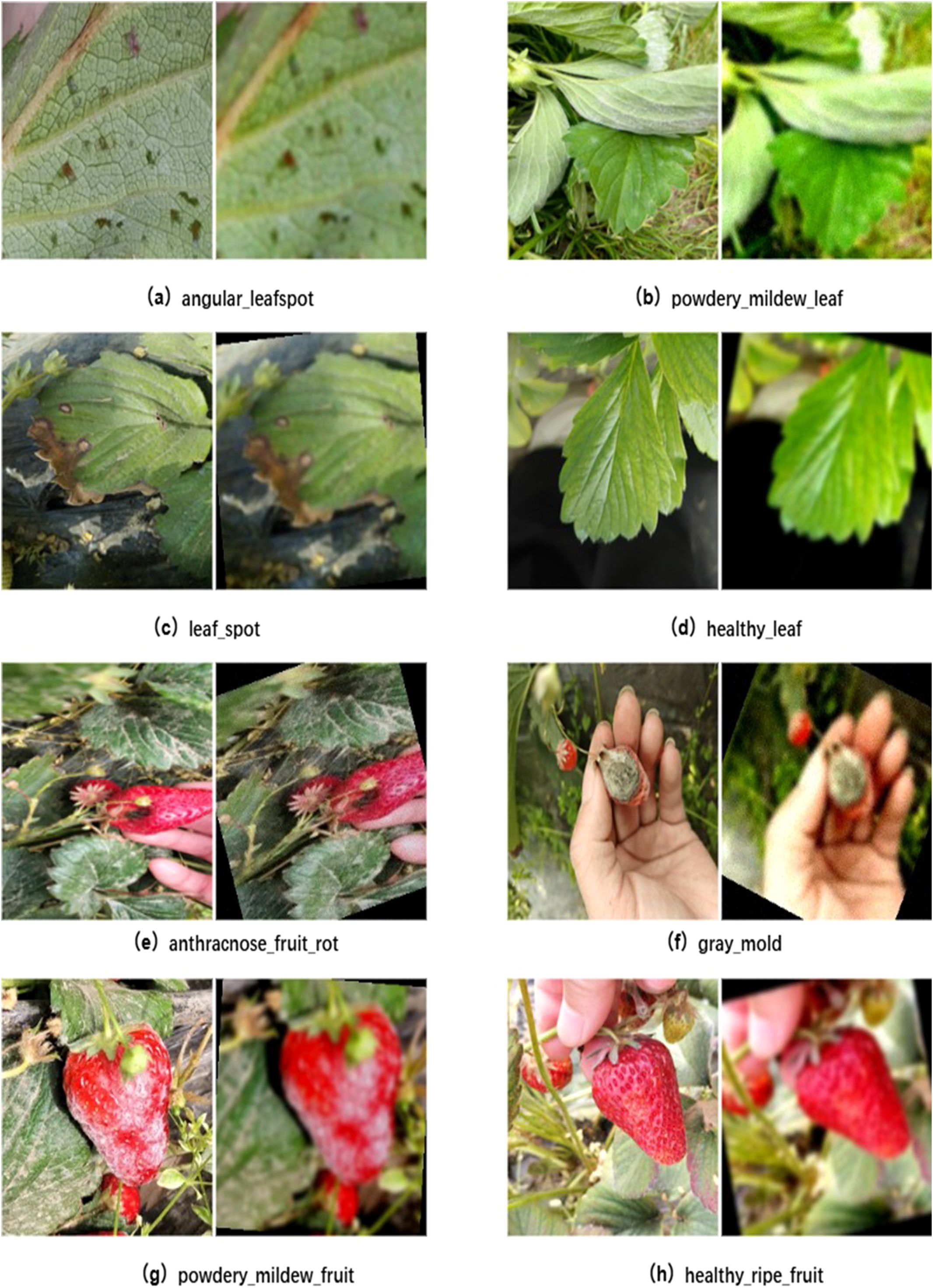 Figure 2. Data augmented healthy and diseased strawberry leaves and fruits (a) angular_leafspot (b) powdery_mildew_leaf (c) leaf_spot (d) healthy_leaf (e) anthracnose_fruit_rot (f) gray_mold (g) powdery_mildew_fruit (h) healthy_ripe_fruit.