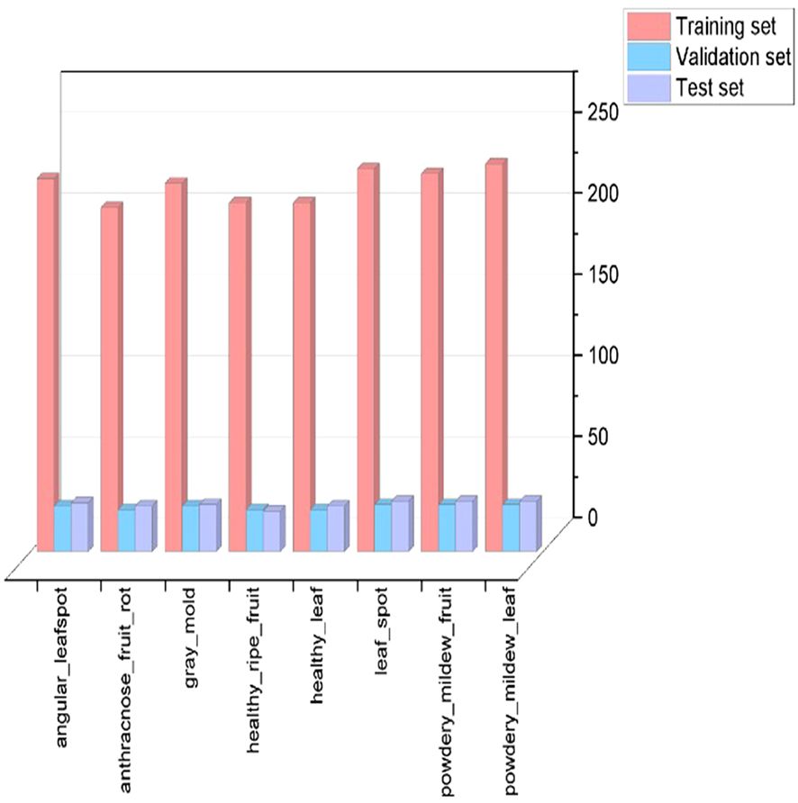 The data augmentation process expanded the dataset to 2,261 samples (Table 1). Stratified random sampling divided the dataset into training, validation, and test sets in an 8:1:1 ratio. The training set facilitated feature learning and parameter optimization, the validation set guided hyperparameter tuning and mitigated overfitting, and the test set provided an independent evaluation of model performance and practical applicability. Dataset partitioning is shown in Figure 3.
