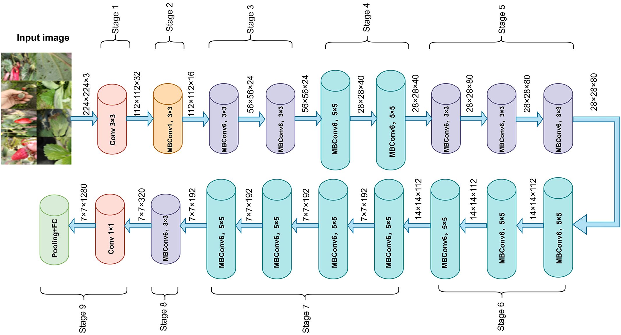 In recent years, CNNs have achieved remarkable success in plant disease recognition and dominate agricultural image analysis (Abade et al., 2021). Classic architectures such as AlexNet, VGGNet, and ResNet (He et al., 2016) are widely used due to their strong feature extraction capabilities. The EfficientNet series is a lightweight architecture that jointly scales network width, depth, and input resolution, reducing complexity while maintaining high accuracy (Tan and Le, 2019). This makes it well-suited for resource-constrained field applications (Wei et al., 2022; Wang et al., 2023). Among them, EfficientNetB0, balancing accuracy and efficiency, has shown strong performance in plant disease recognition (Liu et al., 2020b) and was selected as the backbone for the strawberry disease model. EfficientNetB0 consists of nine stages. Stage 1, also called “stem_conv,” serves as the network’s input stage. It applies a 3×3 convolutional layer, followed by batch normalization (BN) (loffe and Szegedy, 2015) and the Swish activation (Ramachandran et al., 2017), performing the initial spatial downsampling and feature mapping. Stages 2–8 stack MBConv blocks (Sandler et al., 2018) for feature extraction, while Stage 9 forms the classification head with a 1×1 convolution, BN, Swish, average pooling, and a fully connected layer. Each MBConv block includes a 1×1 expansion convolution, depthwise separable convolution (Chollet, 2017), squeeze-and-excitation module, 1×1 reduction convolution, and Dropout to reduce overfitting. The overall architecture is shown in Figure 4, with the MBConv block detailed in Figure 5.