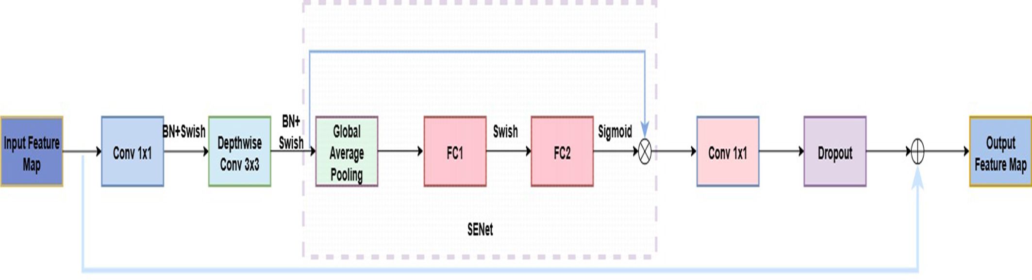 4. After MBConv feature extraction, a lightweight Atrous Spatial Pyramid Pooling (LightASPP) module is integrated. Its output passes through a Mixed Pooling layer, combining average and max pooling, followed by a Dropout layer and a fully connected layer to map features to disease categories. The improved MBConv structure is shown in Figure 7.