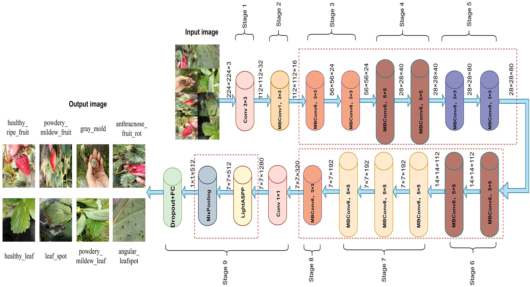 Keywords: strawberry disease classification, EfficientNetB0, deep learning, multi-scale featurefusion, image classification