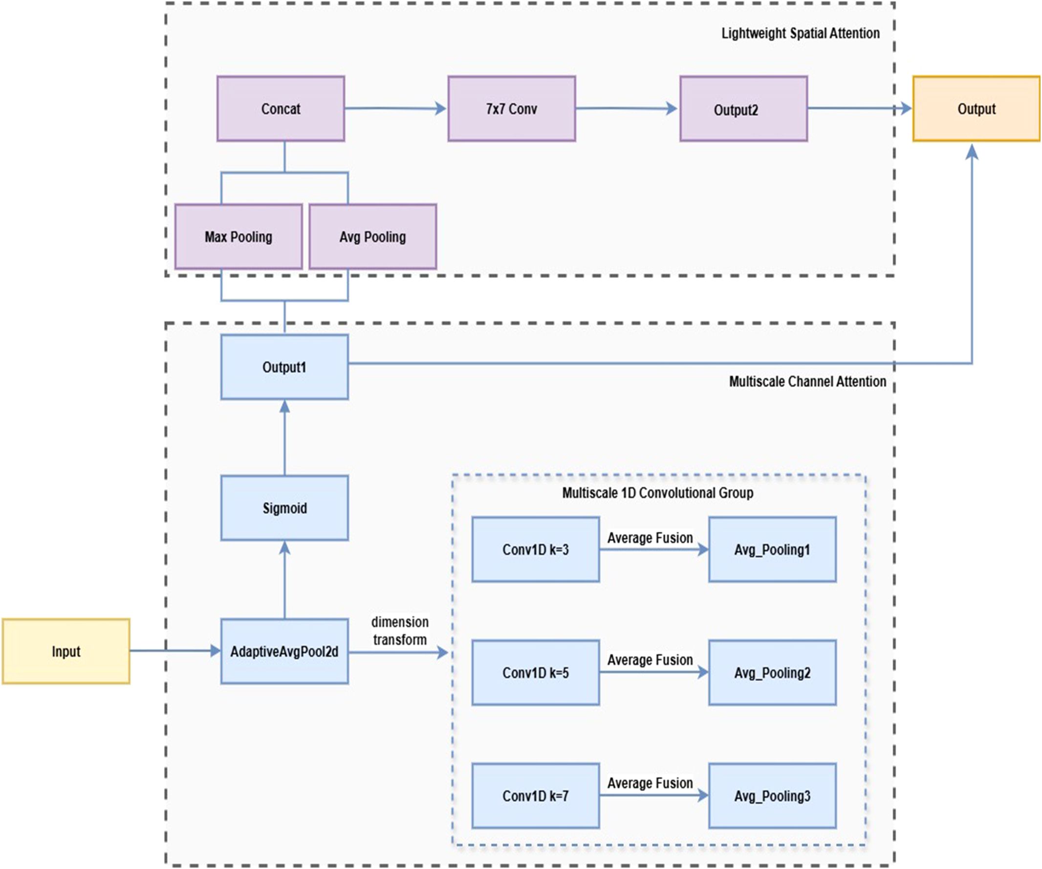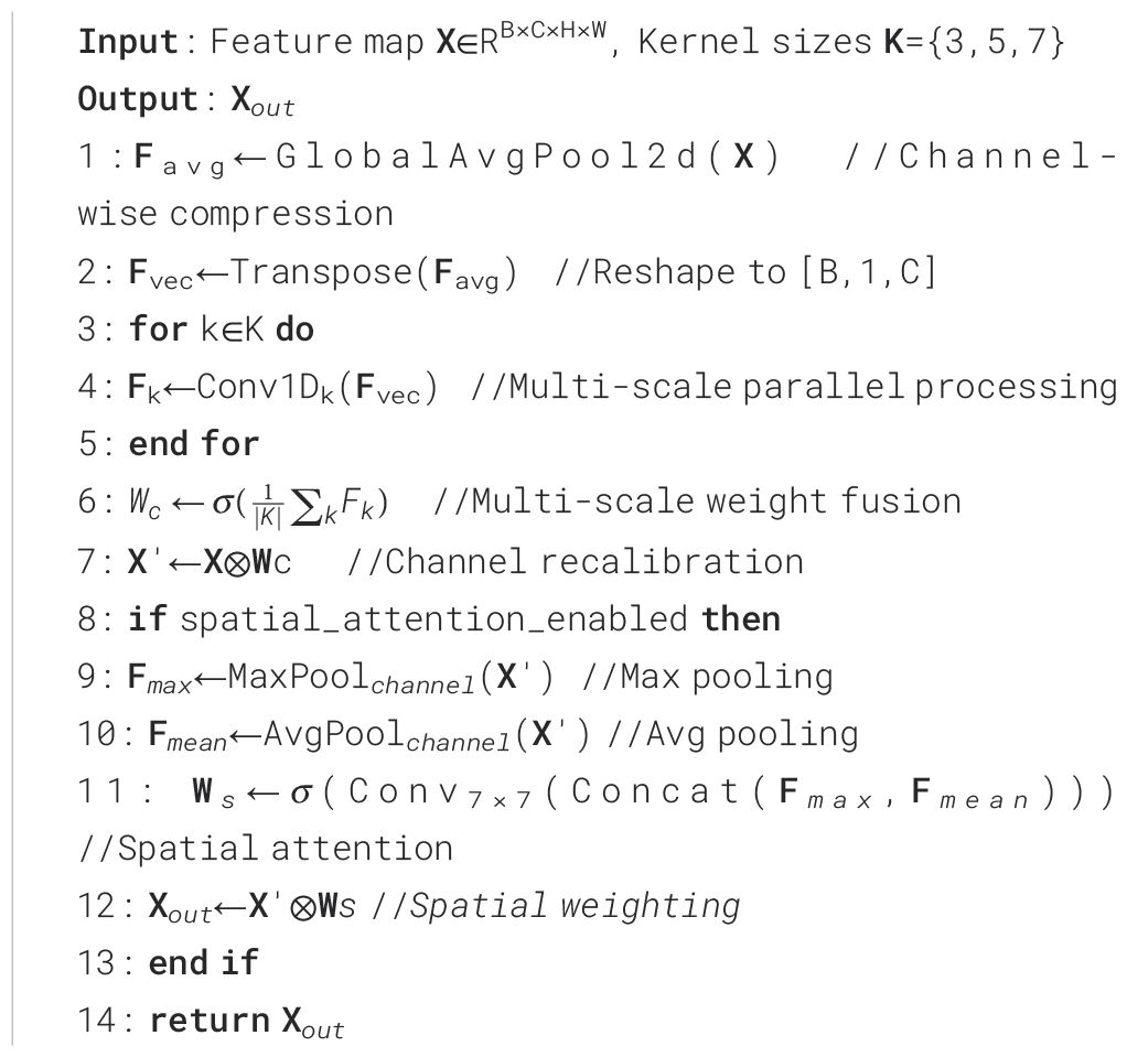 To improve the model’s ability to detect lesions of varying sizes, this paper proposes the MultiScaleECA module based on the Efficient Channel Attention (ECA) mechanism (Wang et al., 2020). While ECA efficiently captures inter-channel relationships using 1D convolutions, single-scale kernels limit adaptability to large lesion size variations. MultiScaleECA employs multiscale 1D convolutions to model channel dependencies across different receptive fields. It also integrates a lightweight spatial attention mechanism to enhance focus on edges and textures, improving lesion localization and suppressing background noise. The overall architecture is shown in Figure 8, with pseudocode in Algorithm 1. The module consists of two main components: