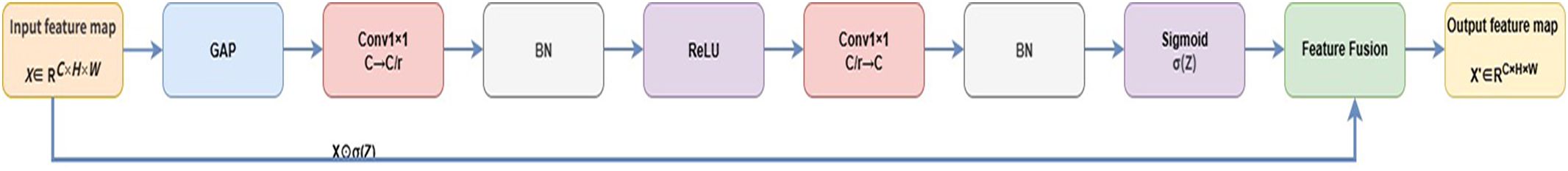 6. Finally, the generated channel weights are multiplied by the original input feature map in a channel-wise manner to perform channel recalibration: