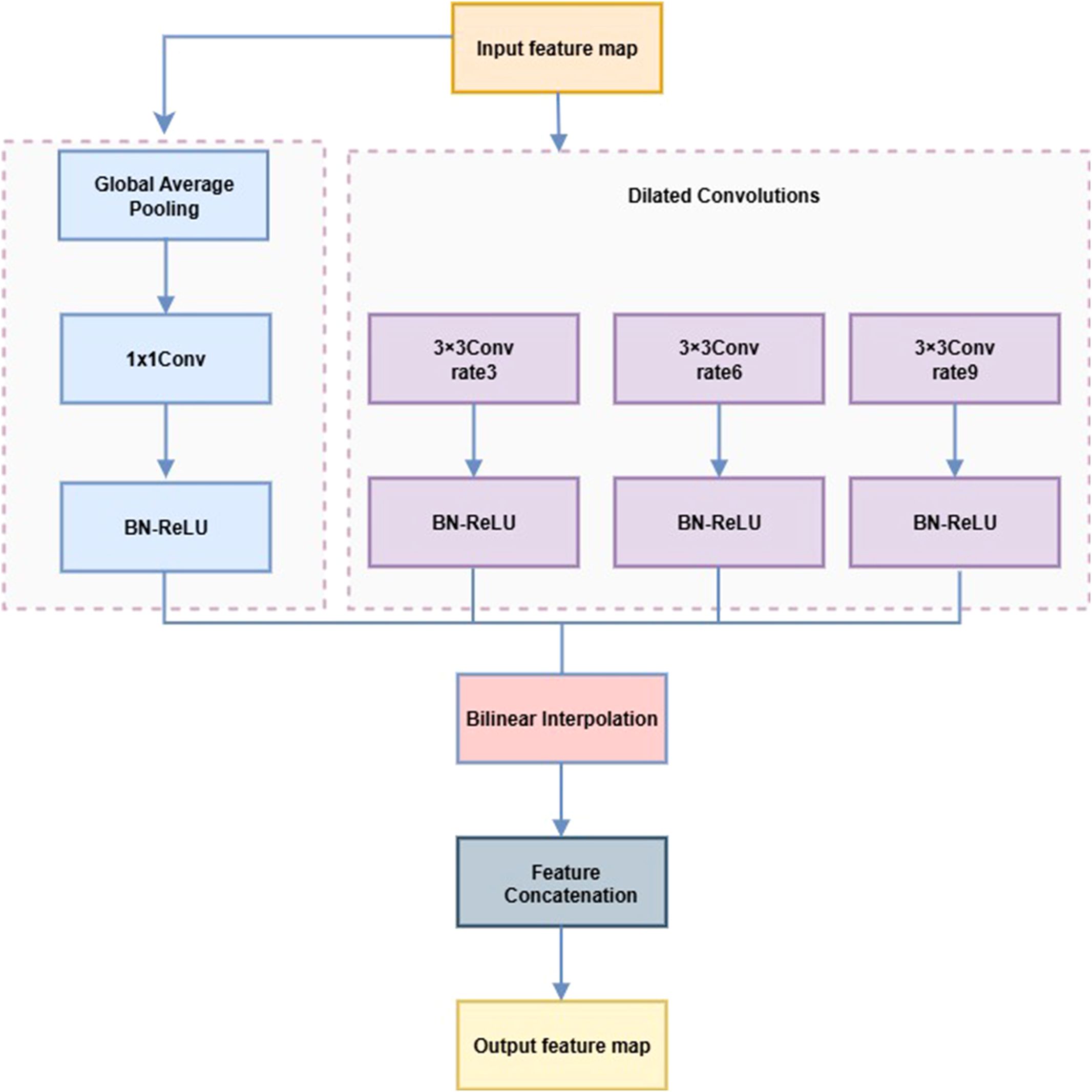 In strawberry disease detection, lesions often exhibit multi-scale variation, diffusion, and morphological diversity, challenging traditional convolutions in capturing spatial context. The LightASPP module uses a streamlined set of multi-scale dilated convolutions to expand the receptive field and enhance multi-scale representation while controlling computational cost. Compared with standard ASPP (Chen et al., 2017), LightASPP introduces three lightweight branches with dilation rates of 3, 6, and 9, each comprising a 3×3 dilated convolution followed by BN and ReLU, omitting redundant 1×1 convolutions. The global average pooling path is retained, with output channels compressed to 128 and aligned via bilinear interpolation, preserving global context efficiently. Multi-scale features are fused through direct concatenation without an additional 1×1 convolution.