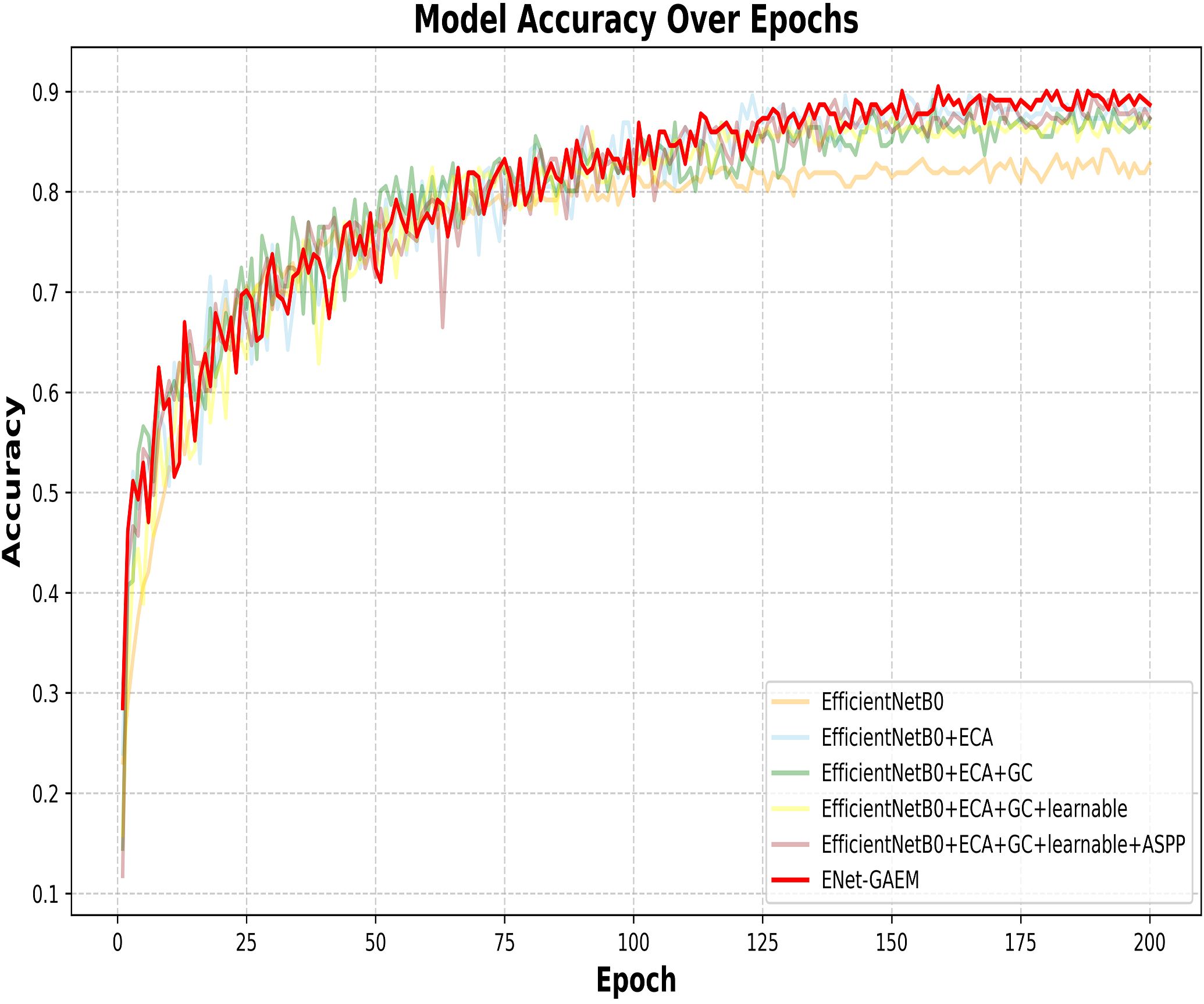ENet-CAEM demonstrates clear advantages: (1) Higher final accuracy: it outperforms other variants during 150–200 epochs, reflecting enhanced feature extraction and performance on complex data; (2) More stable convergence: its accuracy curve is smoother, indicating improved training stability and reduced noise; (3) Faster early-stage learning: it shows the fastest accuracy growth in the first 50 epochs, suggesting accelerated feature learning.