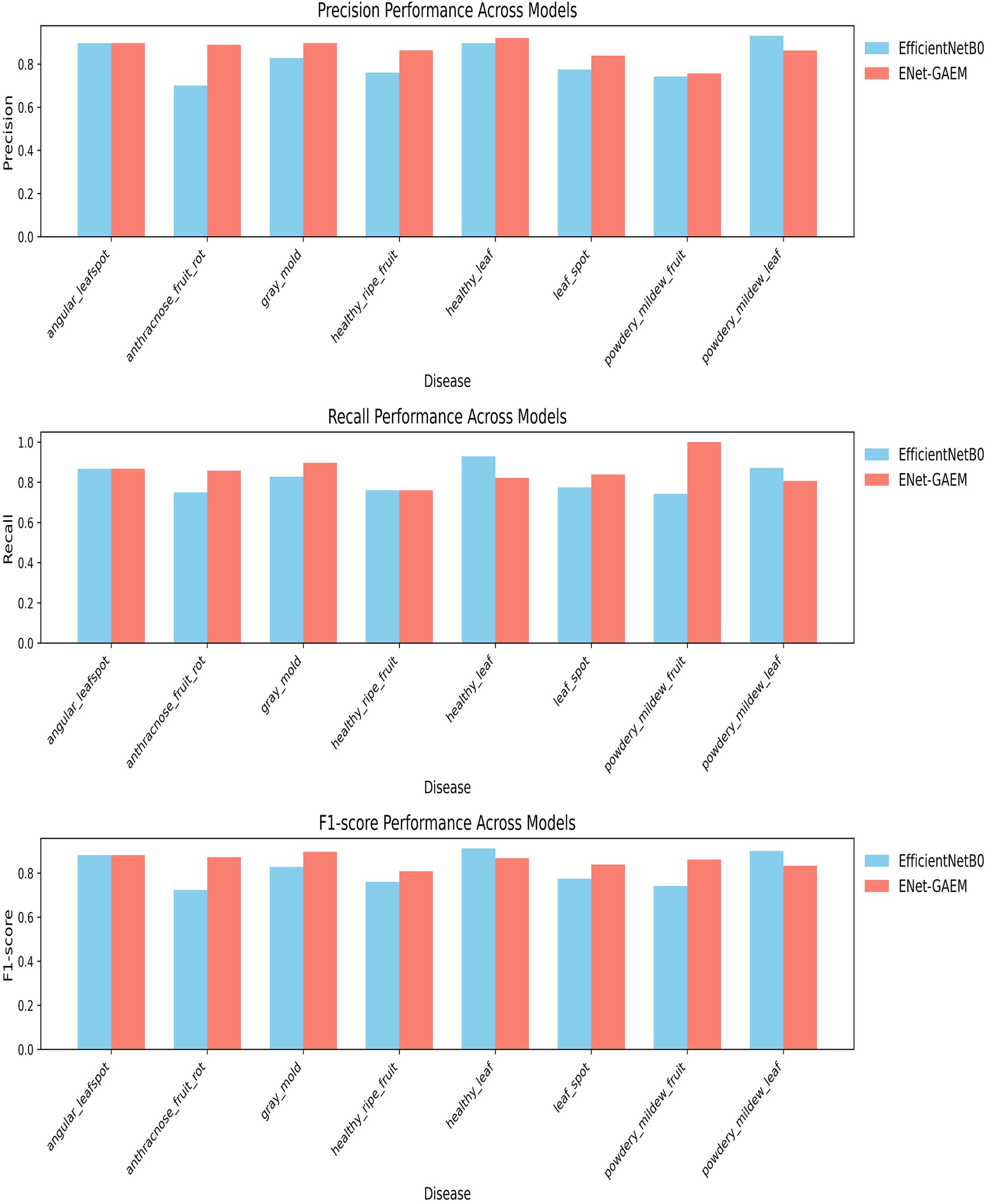 An analysis of precision, recall, and F1 score for EfficientNetB0 and ENet-CAEM in strawberry disease recognition shows that ENet-CAEM consistently outperforms EfficientNetB0 across most disease categories. Its higher precision indicates a more accurate distinction between disease samples and background, reducing misclassification. Higher and more stable recall demonstrates a stronger capability to detect diverse disease types, minimizing missed detections. Consequently, the F1 score also remains higher and more consistent, reflecting a balanced and reliable performance across all evaluated categories.