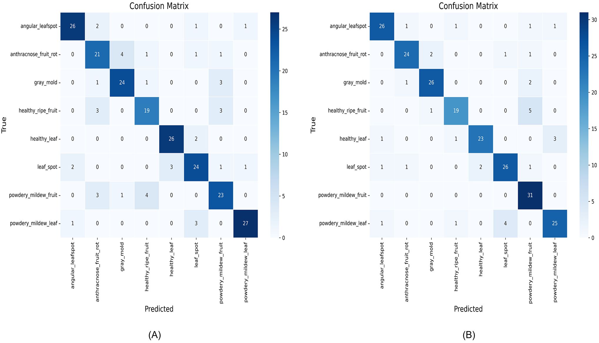 A comparative analysis of the confusion matrices reveals that EfficientNetB0 frequently misclassifies several strawberry disease categories. For instance, angular leafspot, gray mold, and powdery mildew fruit samples are often incorrectly predicted, indicating challenges in distinguishing visually similar or complex diseases. The relatively weak diagonal values reflect limited overall recognition accuracy, with 190 images correctly classified. In contrast, the ENet-CAEM confusion matrix shows clear improvements: the number of correctly classified images increased to 200, a gain of 10 over the baseline, and misclassification rates for anthracnose_fruit_rot, gray mold, leaf spot, and powdery_mildew_fruit were significantly reduced. These results demonstrate that integrating modules such as CCM and MultiScaleECA effectively enhances the model’s recognition of diverse strawberry disease categories.