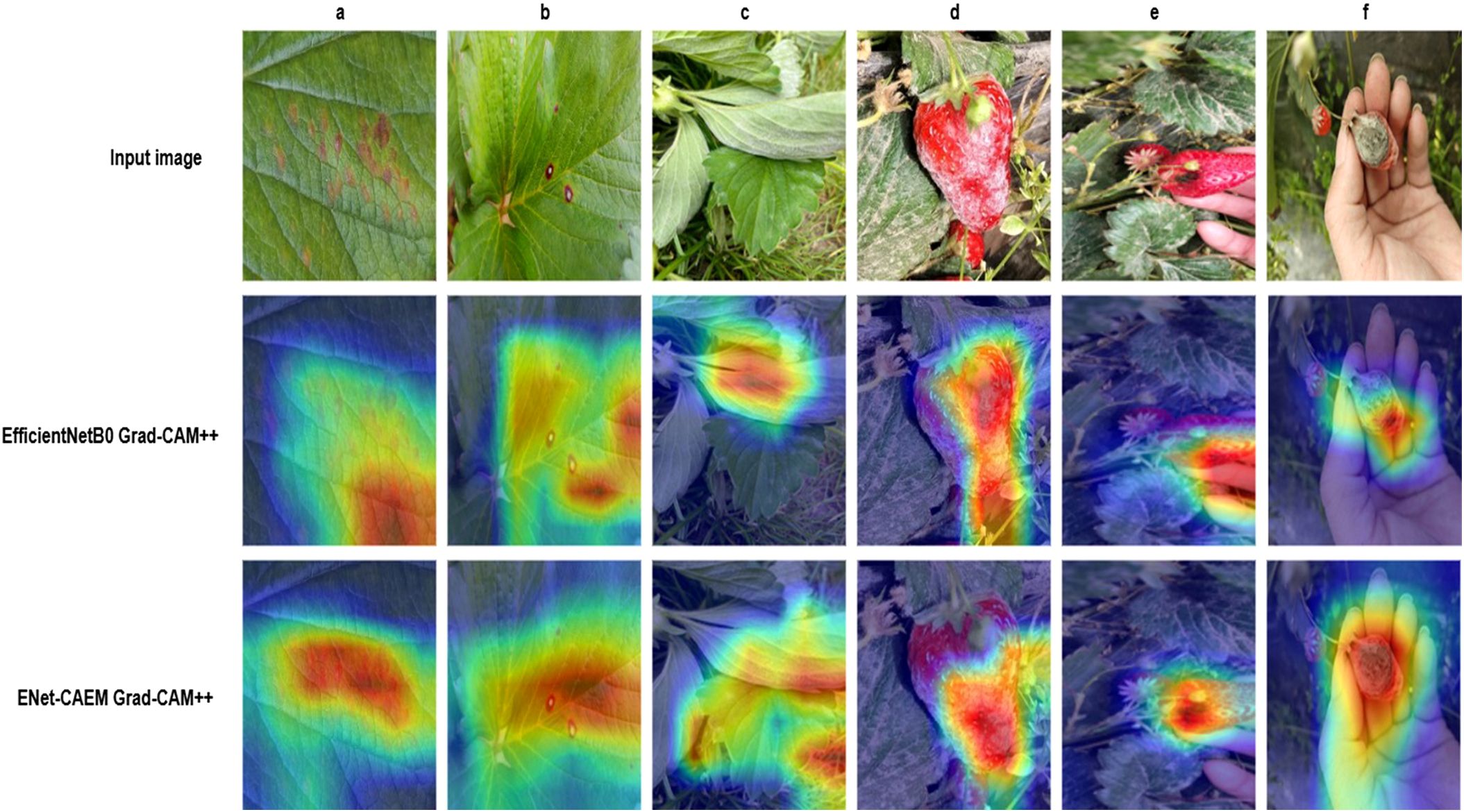 The visualization results reveal that, in some disease samples, the EfficientNetB0 model tends to focus on areas unrelated to lesions while overlooking critical disease information. In contrast, the ENet-CAEM model accurately concentrates on diseased regions with minimal interference from complex backgrounds. Overall, the ENet-CAEM model effectively captures lesion features across different locations and scales, demonstrating superior discriminative power and interpretability.