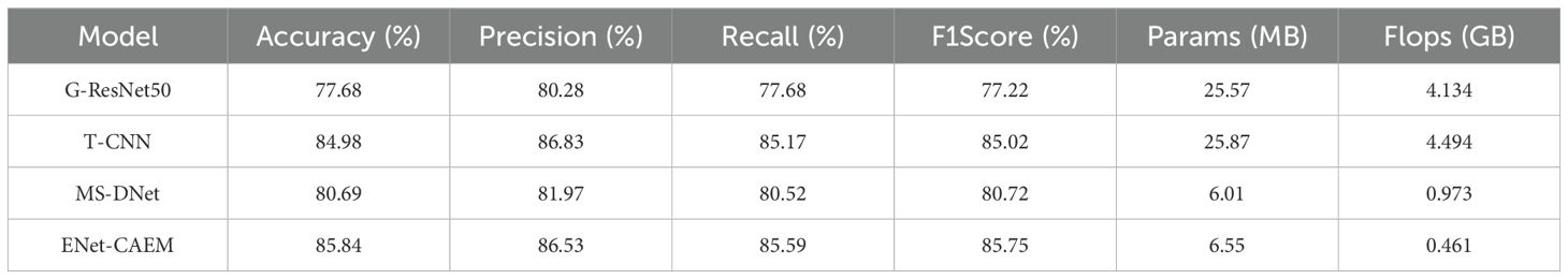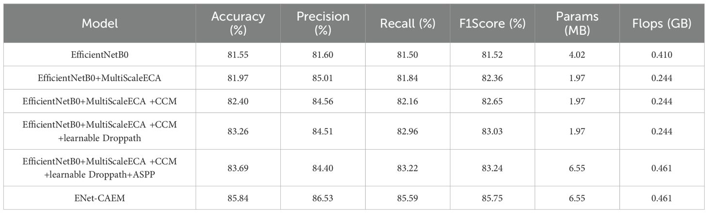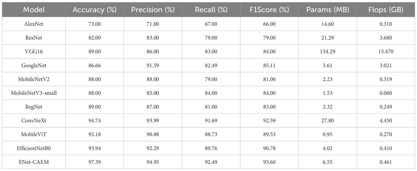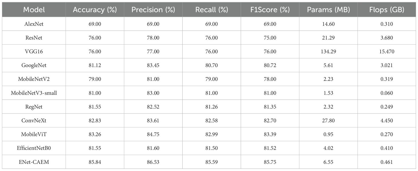 ENet-CAEM achieved the highest accuracy, precision, recall, and F1 score among all compared models, and maintained a lower parameter count and computational complexity. These findings confirm that the proposed improvements effectively enhance model performance and efficiency.