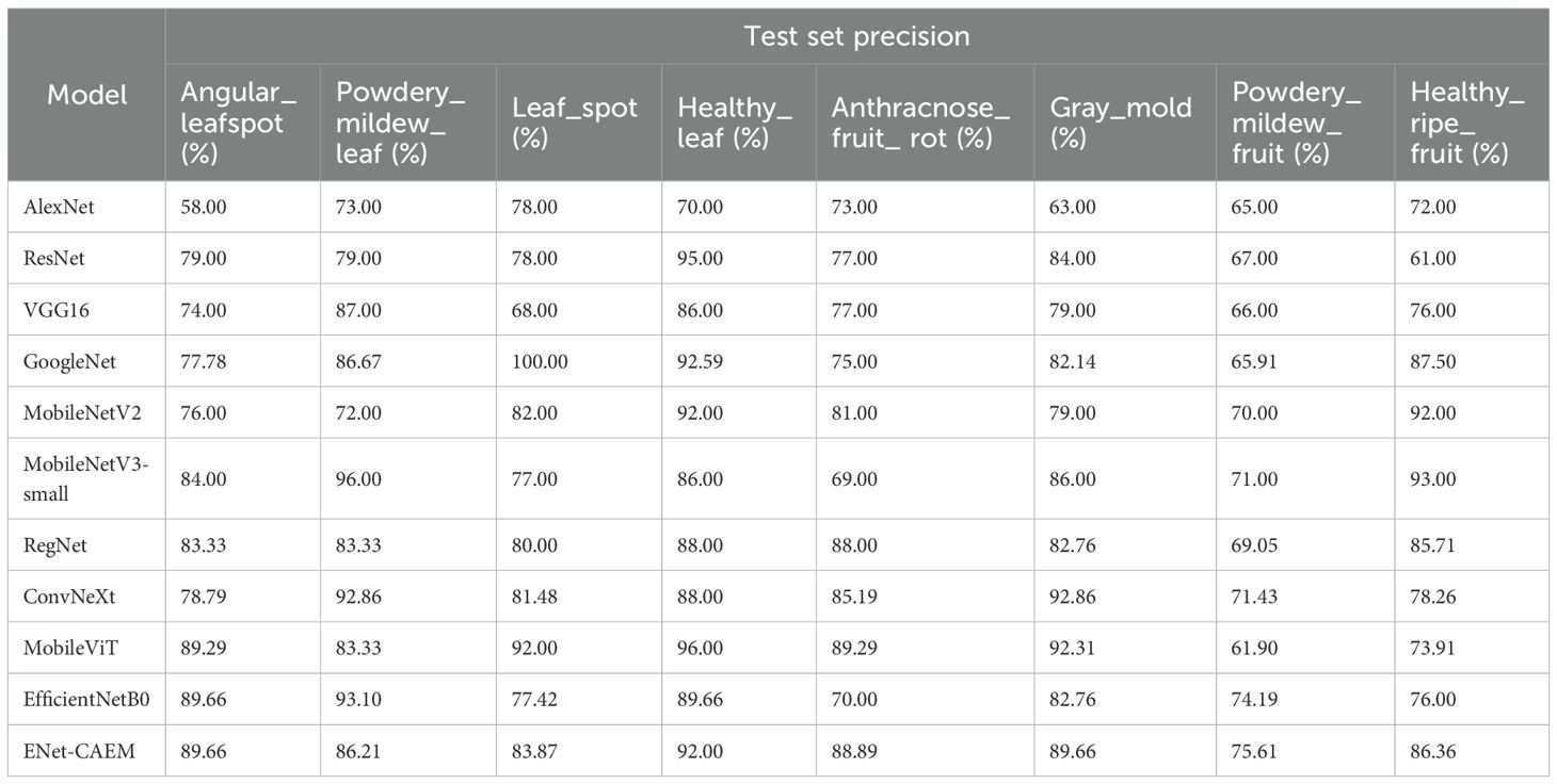 As shown in Table 3, ENet-CAEM consistently outperformed other models in strawberry disease recognition. For leaf diseases, it achieved accuracies of 89.66%, 86.21%, and 83.87% for angular leaf spot, powdery mildew, and leaf spot, respectively. It ranked among the top across all models, indicating strong discriminative capability in handling leaf diseases characterized by complex lesion morphology and blurred boundaries. For fruit diseases, accuracies reached 88.89% for anthracnose, 89.66% for gray mold, and 75.61% for fruit powdery mildew. This indicated that the improved model possessed high feature sensitivity and generalization capability. It effectively handled complex characteristics such as small spots, blurred diffusion, and powder-like textures on diseased fruit surfaces. Healthy samples were also accurately classified, with 92.00% and 86.36% accuracy for healthy leaves and fruits, respectively. This performance remained consistently high across all models and effectively reduced the risk of misclassifying healthy samples as diseased.