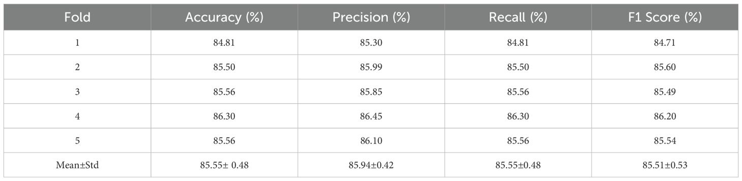 We evaluated the robustness and stability of the ENet-CAEM model under limited data conditions through 5-fold cross-validation, as shown in Table 7. The model achieved an average accuracy of 85.55%, closely matching the 85.84% accuracy on the independent test set, with only a 0.29% difference. All key metrics showed minimal variation, with standard deviations within ±0.5%, indicating stable performance across folds and confirming the model’s strong feature extraction capability and robustness.