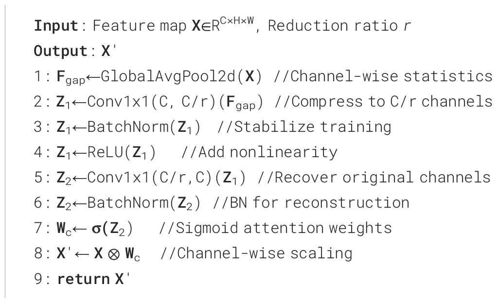 To improve robustness against complex background interference, a Channel Context Module (CCM) is added in intermediate stages. Inspired by the SE mechanism (Hu et al., 2018), it uses global channel statistics to recalibrate features, thereby enhancing lesion regions and suppressing background noise. For input , global average pooling produces a context vector, which passes through a 1×1 convolution to reduce channels to with ReLU, then a second 1×1 convolution restores channels to . Sigmoid activation generates context-aware weights , applied to via element-wise multiplication to yield . Batch normalization is applied during compression and reconstruction for stability. Figure 9 shows the structure, and Algorithm 2 provides pseudocode.