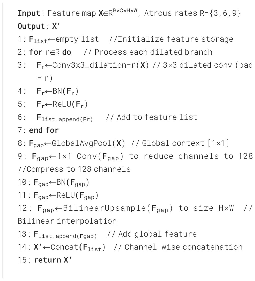 This module is integrated into the top feature layer of EfficientNetB0 to enhance adaptability to complex lesion morphology while maintaining a lightweight design. The small (rate=3), medium (rate=6), and large (rate=9) dilation branches capture early, typical, and diffuse lesions, respectively, while the global pooling path improves recognition of densely distributed spots. The LightASPP structure is shown in Figure 10, and its pseudocode is provided in Algorithm 3.