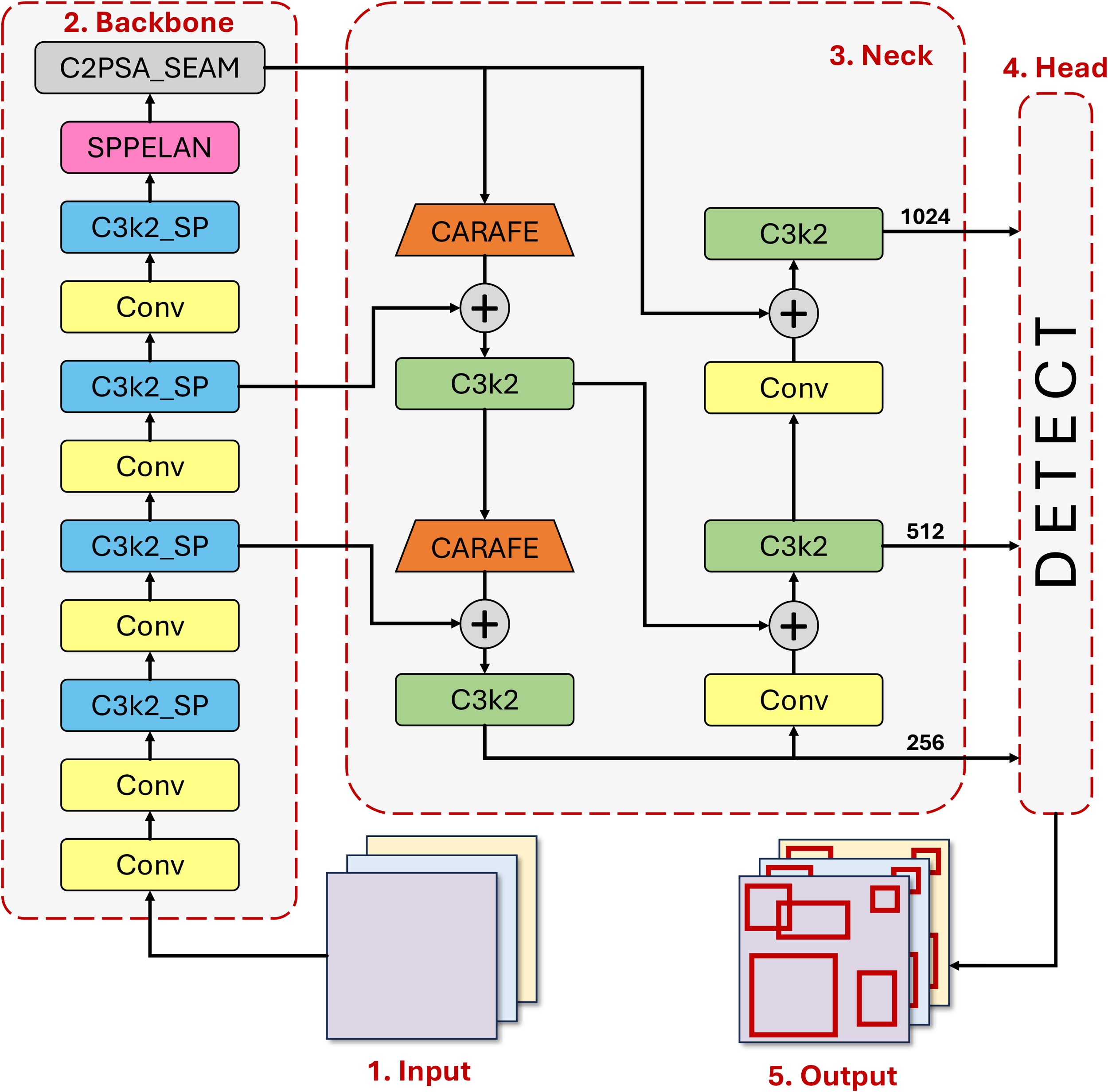 1. Innovatively designed a Backbone network with downsampling: by streamlining the feature extraction path, it solves the problems of long training time and weight redundancy caused by the detection Neck in YOLOv11 and the auxiliary branch structure in YOLOv9 (Wang et al., 2024), and improves the model inference efficiency while retaining key spatial features;