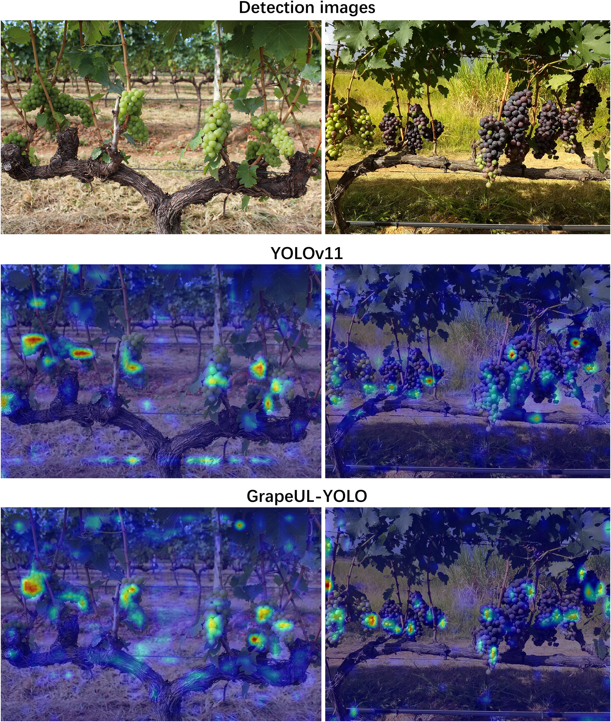 To explore the feature learning mechanism of GrapeUL-YOLO, a visual attention comparison experiment was conducted. Two grape varieties were selected, and the model’s ability to focus on targets was evaluated through the color depth of the heatmap (red represents high attention, blue represents low attention). The Grad-CAM technology (Selvaraju et al., 2017) was used to visualize the regions of the model that focus on grape targets, and the results were compared with those of YOLOv11, as shown in Figure 3.