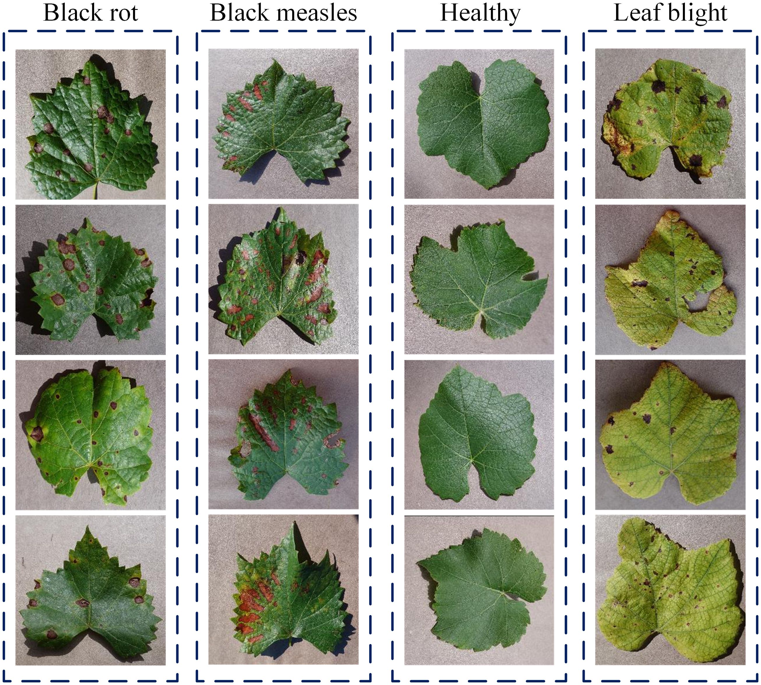 As illustrated in Figure 1, this study systematically investigates four distinct categories: black rot (Molitor and Beyer, 2014), black measles (Ji and Wu, 2022), leaf blight (Liu et al., 2020), and healthy leaves. This selection was based on comprehensive considerations of agricultural economic impact, diagnostic challenges, and practical disease management requirements. These three diseases represent the most destructive foliar pathologies in viticulture. Black rot, as a highly contagious fungal disease, can cause devastating yield losses under humid conditions, with its characteristic concentric ring patterns providing distinct visual markers for early diagnosis. Black measles, characterized by prolonged latency and subtle symptoms, often leads to irreversible vascular damage before detection, resulting in cumulative negative effects on long-term plant productivity. Leaf blight, as an environment-sensitive disease, shows a strong correlation with field management practices and exhibits significant spatial heterogeneity in symptom manifestation. During early development stages, all three diseases manifest as leaf spots, but demonstrate clearly divergent pathological characteristics in later phases, creating an ideal difficulty gradient for developing classification models with fine-grained recognition capabilities. From an agricultural practice perspective, these diseases require significantly different control timings and chemical treatments. Moreover, their epidemic patterns cover all critical phenological stages of grape growth, enabling the developed diagnostic system to provide comprehensive seasonal coverage. Detailed category descriptions are as follows: