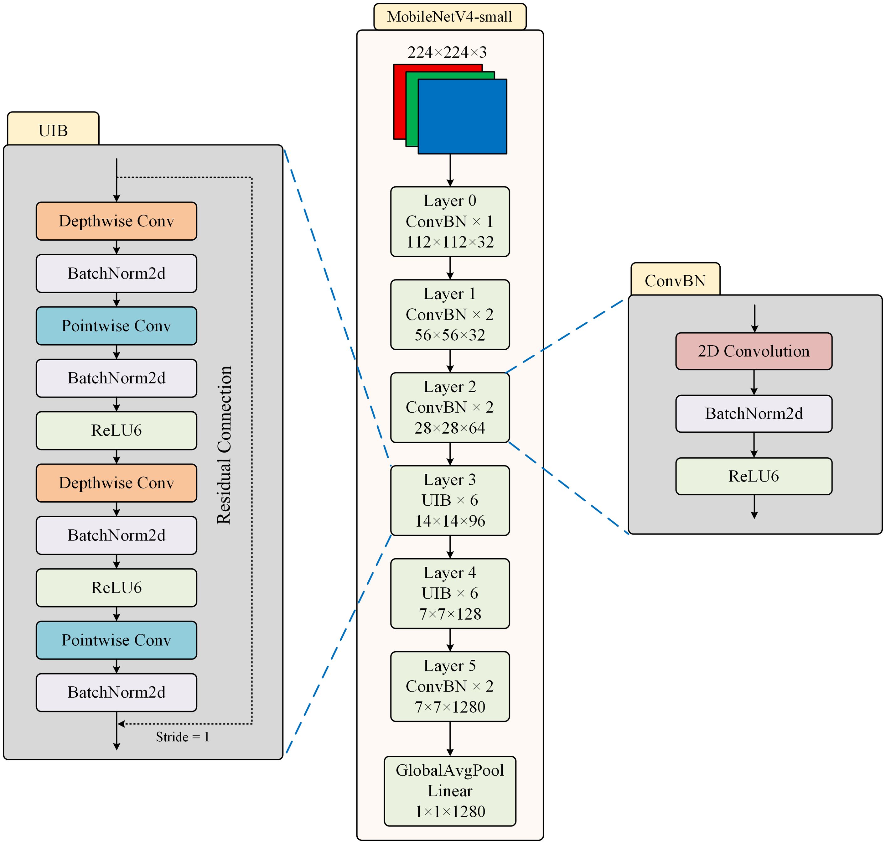 MobileNetV4 is a lightweight convolutional neural network architecture proposed by Google in 2024 (Qin et al., 2024). It is the latest iteration of the MobileNet series and aims to further optimize the balance between computational efficiency and model performance on mobile devices and edge computing devices. This architecture continues the core idea of the MobileNet family in lightweight design, while through structural innovation and training strategy improvements, it significantly enhances the model’s performance in image classification.