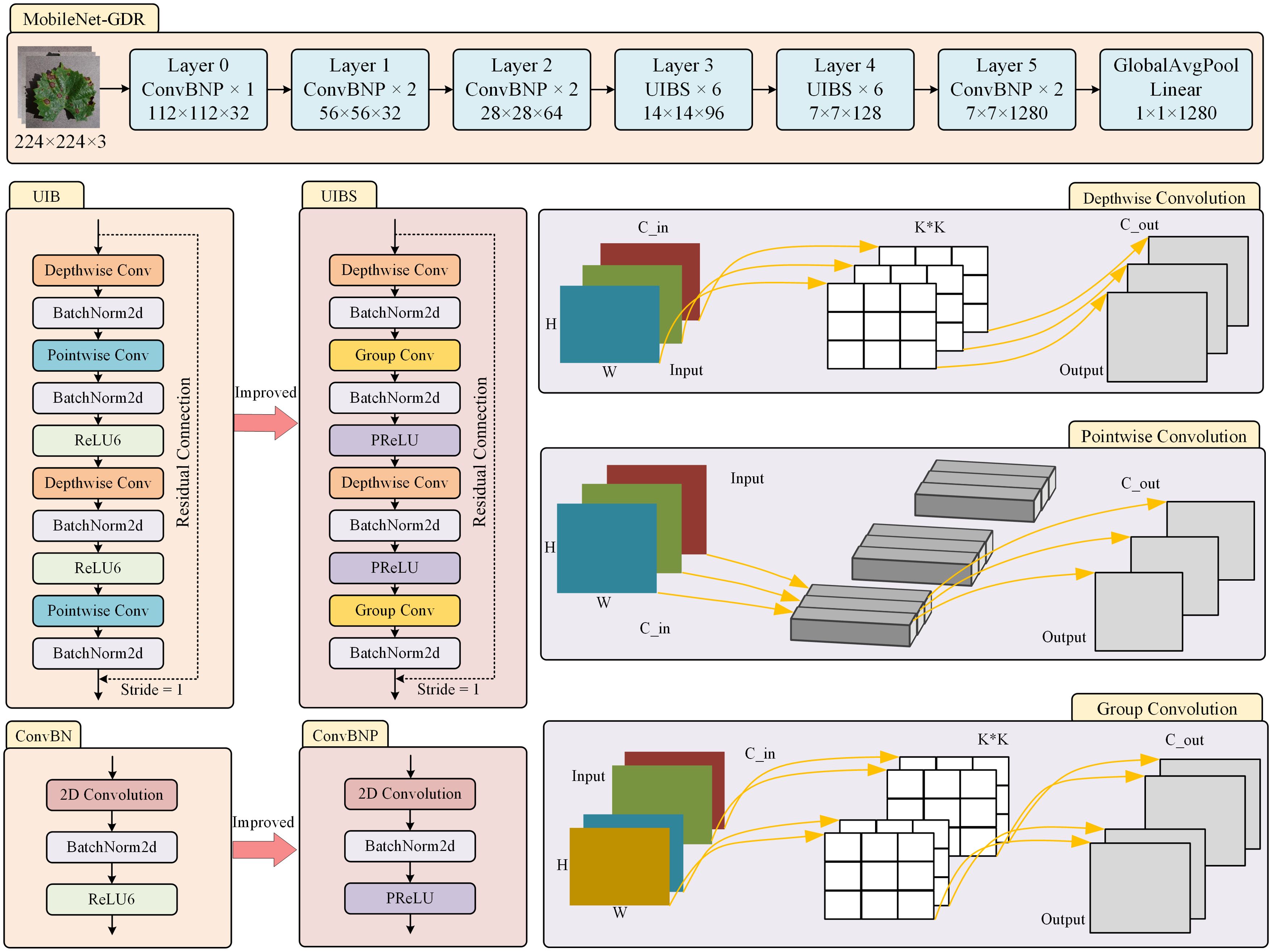 To address the limitations of existing models in achieving an optimal balance between accuracy and computational cost for mobile deployment, this study proposes MobileNet-GDR, a lightweight image classification algorithm optimized for grapevine leaf disease diagnosis. Building upon the MobileNetV4 (Qin et al., 2024) architecture, our principal contributions are threefold:
