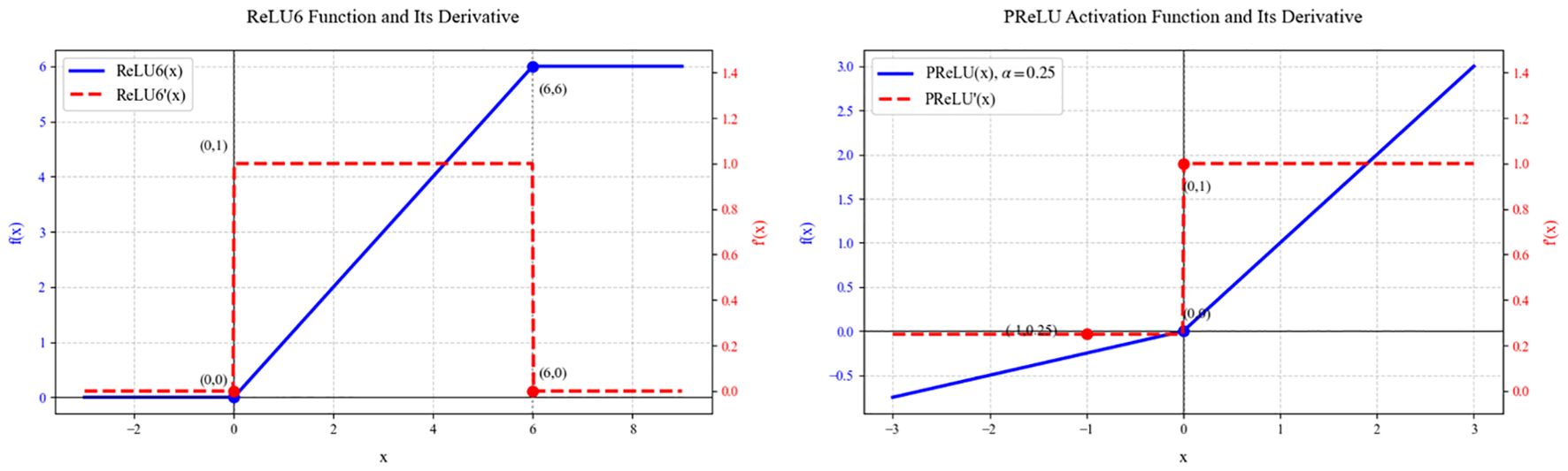 In the negative value region (x < 0), neuronal activation is completely suppressed. In the positive value region, it exhibits linear growth characteristics. However, when the input value exceeds 6, it enters the saturation region. This design ensures that the derivative maintains a constant gradient of 1 in the (0, 6) interval, while the gradient abruptly drops to 0 when x ≤ 0 or x ≥ 6, resulting in a distinct gradient clipping phenomenon. While this hard constraint enhances numerical stability during mobile deployment and facilitates model quantization, the non-continuous gradient characteristics can easily trigger the vanishing gradient problem during training of deep networks, especially when the network is deep or the learning rate is improperly set, potentially causing a large number of neurons to enter an irreversible “dead” state. In contrast, the function expression of PReLU is shown in Equation 9.