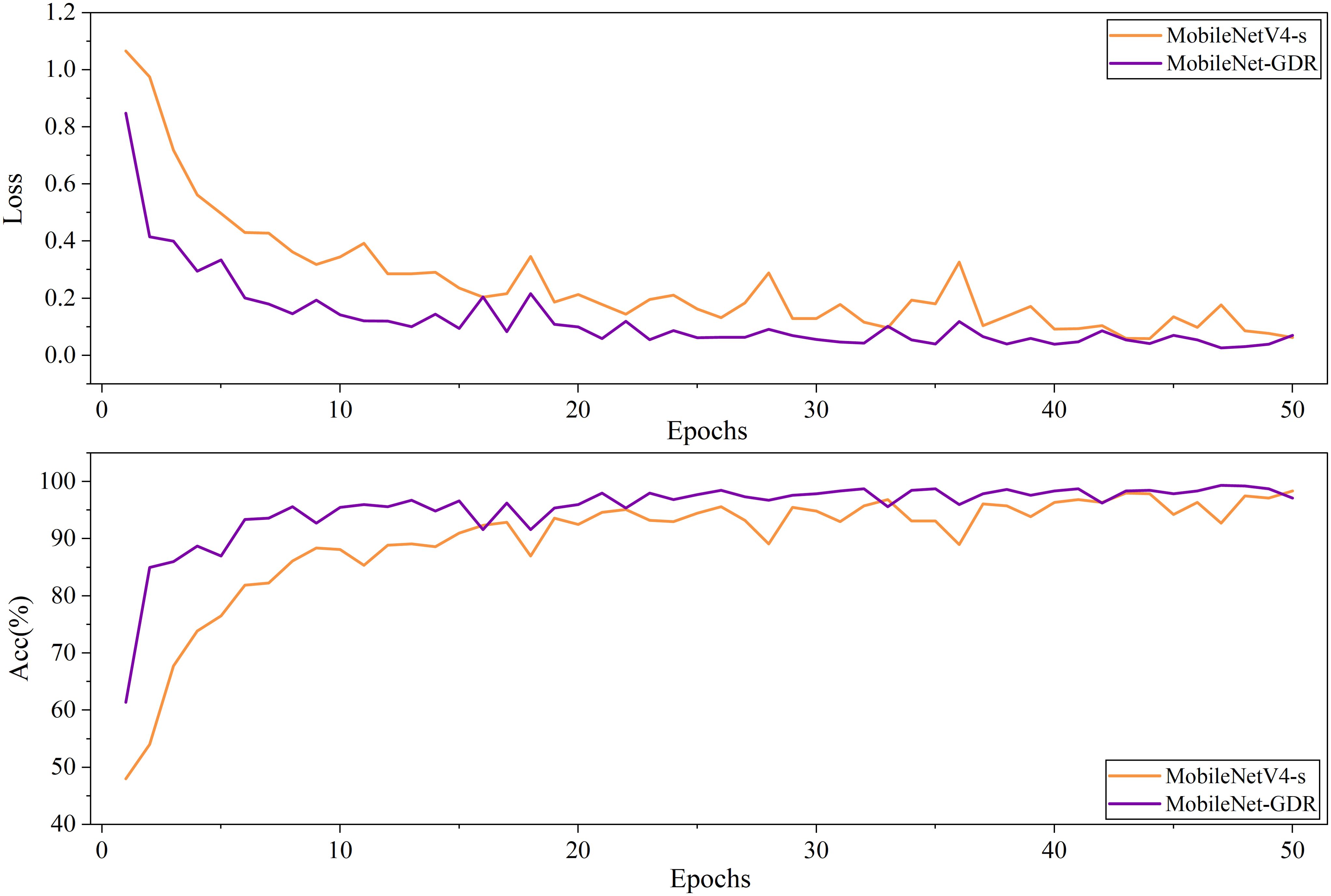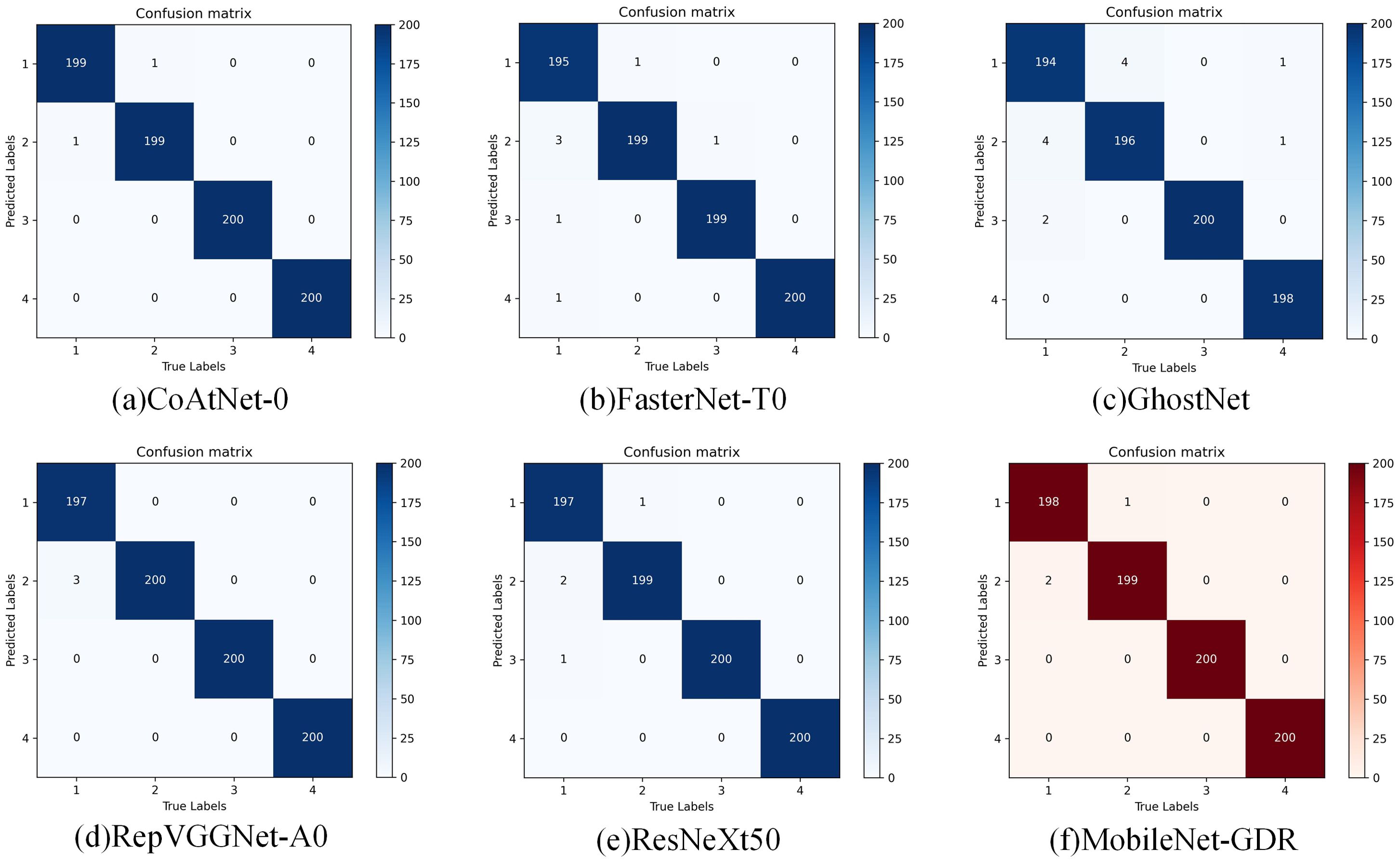 As shown in Table 4, MobileNet-GDR demonstrated outstanding overall performance in this comparative experiment. Through systematic experimental comparison and analysis, we can clearly see that this model has achieved a breakthrough balance in multiple key dimensions. From the perspective of model accuracy, MobileNet-GDR’s performance is impressive. Experimental data shows that its classification accuracy reaches 99.625%, tying with RepVGGNet-A0 for second place and trailing the top-performing CoAtNet-0 by a mere 0.125 percentage points. More notably, its precision, recall, and F1 scores all remain above the high level of 99.6%, fully demonstrating the model’s stable and reliable classification capabilities. This nearly perfect accuracy makes it fully capable of handling most application scenarios with stringent requirements for recognition accuracy. In terms of model efficiency, MobileNet-GDR’s advantages are even more prominent. Its parameter count is kept at an extremely low 1.75M, which is only 77% of the lightweight model FasterNet-T0 and approximately one-tenth of the large model CoAtNet-0. In terms of computational complexity metrics, the 0.18G FLOPs performance is second only to GhostNet, but considering the significant accuracy gap between GhostNet and MobileNet-GDR, this minor difference in computational load is entirely acceptable. Notably, the model achieves a significant leap in computational efficiency while maintaining top-tier accuracy.