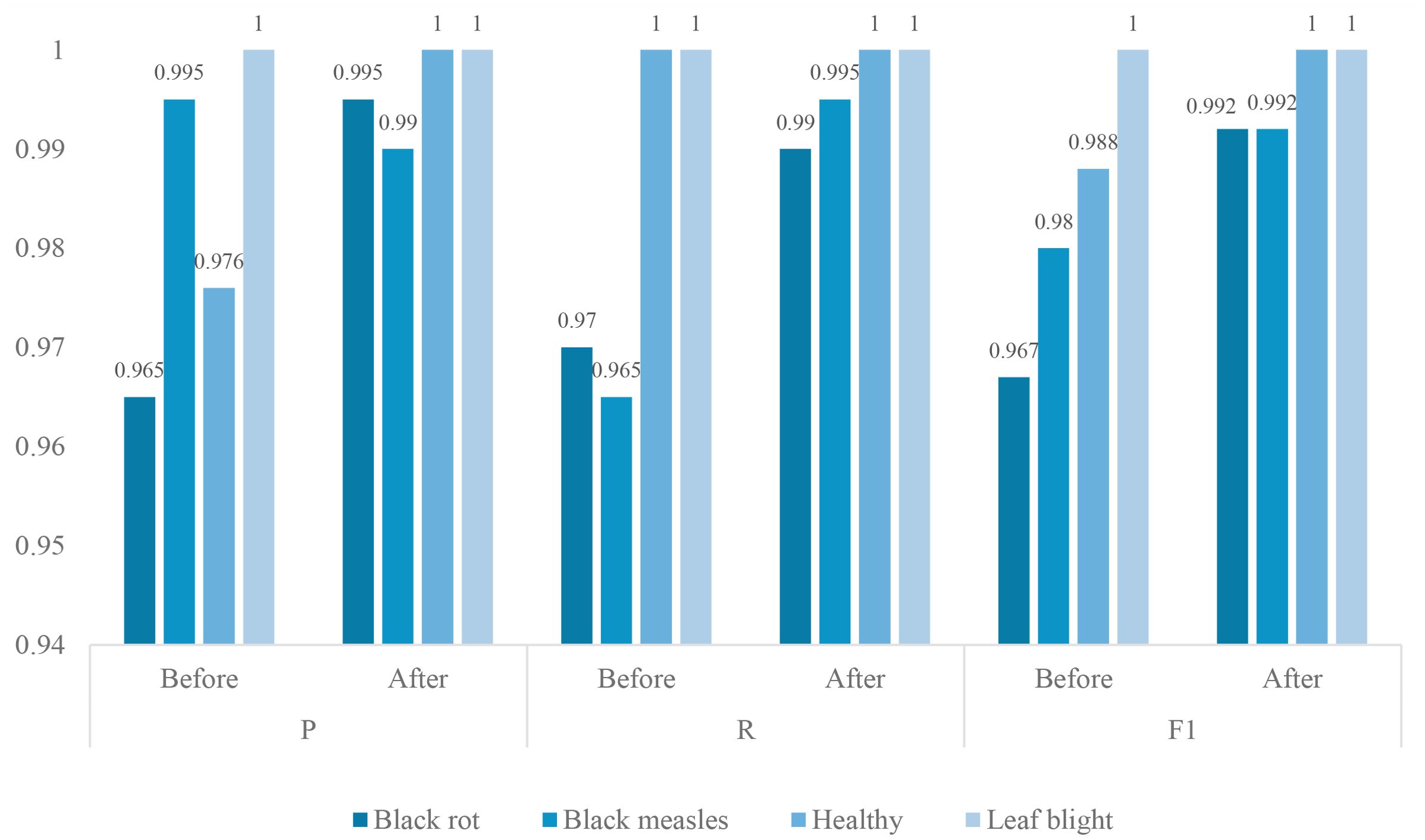 Figure 7 shows the recognition differences in each category before and after the model improvement. By comparing the performance metrics of various categories before and after the improvements, it is clear that the model optimization has led to significant enhancements. Across the four plant health status categories, the improved model demonstrates comprehensive and balanced performance improvements, particularly in the more challenging disease categories. The most notable improvement was observed in the Black rot category, where the F1 score increased from 0.967 to 0.992, representing a 2.5 percentage point increase. This improvement is primarily due to a significant increase in accuracy (from 0.965 to 0.995), indicating that the improved model has significantly reduced misclassification of this disease. Meanwhile, the recall rate has also increased from 0.970 to 0.990, indicating that the model has reduced the rate of missed detections of Black rot cases and can more comprehensively capture the features of this category. The Black measles category exhibits a different improvement pattern. Although precision slightly decreased (from 0.995 to 0.990), recall significantly improved from 0.965 to 0.995, ultimately increasing the F1 score from 0.980 to 0.992. This change suggests that the improved model may have adjusted the classification boundaries, opting for a slight decrease in precision in exchange for a higher recall rate, which is typically a more desirable strategy for disease detection tasks. The Healthy and Leaf blight categories already performed exceptionally well before the improvement and now achieve perfect scores. The precision of the Healthy category increased from 0.976 to 1.000 while maintaining a 100% recall rate, while the Leaf blight category continued to achieve perfect scores across all metrics. These results demonstrate that the improved model maintains accurate identification of healthy samples while significantly enhancing its ability to detect diseased samples.