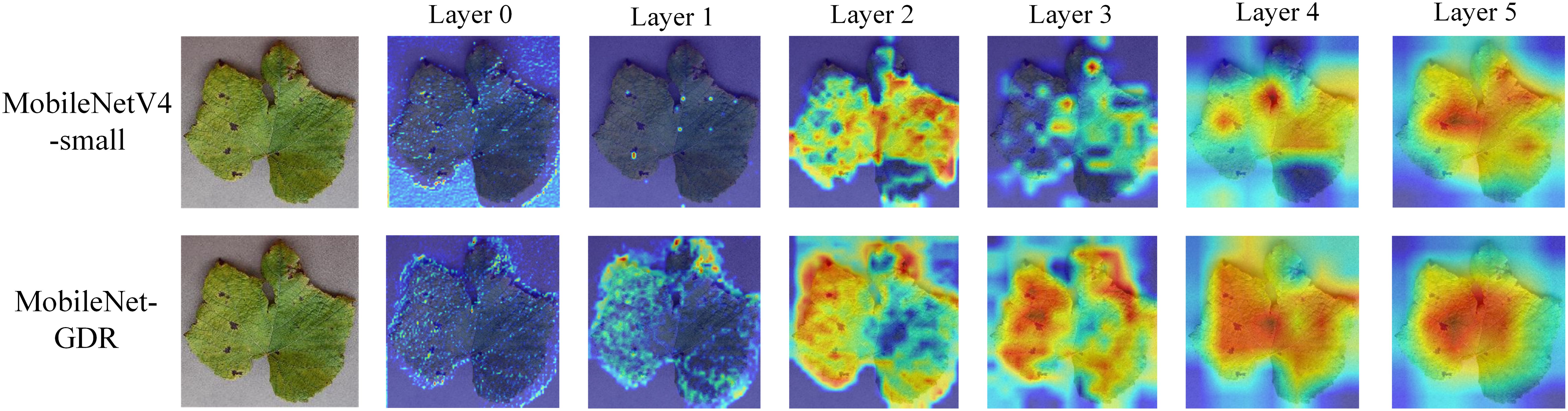 To qualitatively validate the enhanced feature representation capability of our proposed MobileNet-GDR, we present a visual comparison of Grad-CAM heatmaps generated by the baseline MobileNetV4-small and our model in Figure 8. The results demonstrate that our model achieves superior focus and localization on the pathological regions. A critical analysis of the deeper layers (Layer 3 to Layer 5) reveals a distinct difference in the models’ attention mechanisms. The activation maps from MobileNetV4-small (Figure 8, top row) are often more diffuse and scattered, with significant activation spillover onto healthy leaf tissue and background areas. This suggests that the baseline model relies on a broader, and potentially less relevant, contextual footprint for classification, which may introduce ambiguity. In contrast, our MobileNet-GDR (Figure 8, bottom row) produces remarkably precise and concentrated activation heatmaps. The model’s focus is sharply confined to the core lesion areas, such as the necrotic spots and the boundaries between diseased and healthy tissue. Concurrently, the optimized feature channels resulting from the grouped convolution design may contribute to a more efficient and discriminative feature representation in the deeper layers. This visual evidence aligns perfectly with our quantitative results, confirming that MobileNet-GDR does not merely achieve higher accuracy but does so by developing a more semantically meaningful understanding of the disease features, thereby strengthening the model’s interpretability and reliability for practical agricultural diagnosis.