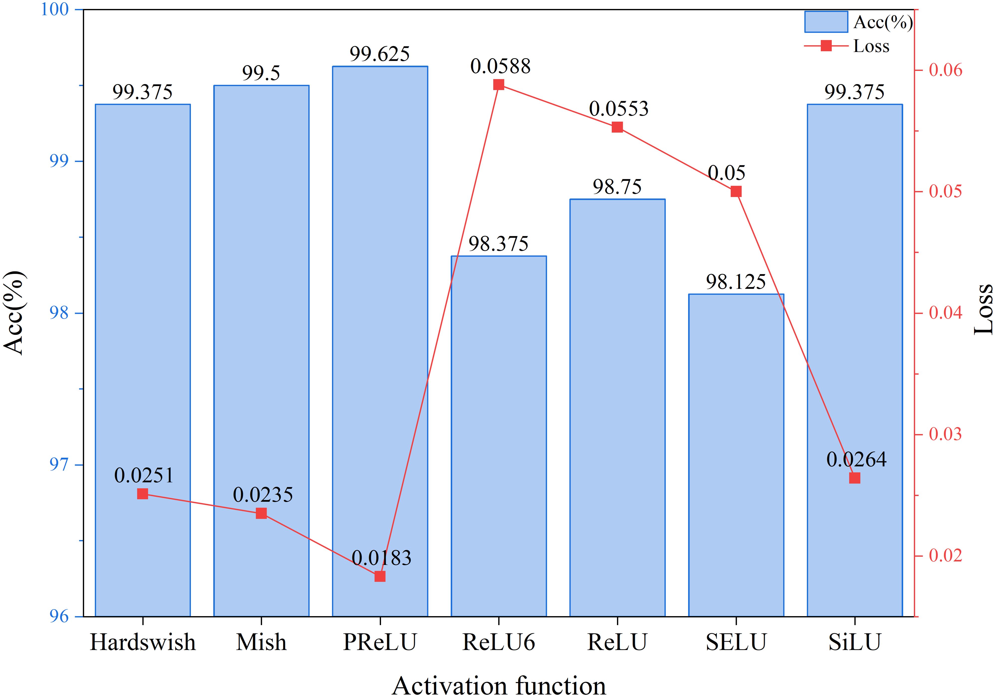 As shown in Figure 9, through an in-depth analysis of the activation function comparison experiment, it is clear to observe the significant impact of different activation functions on model performance. The experimental results indicate that the PReLU activation function demonstrates the most outstanding overall performance, achieving an accuracy rate of 99.625%, significantly outperforming other candidate schemes, while maintaining the lowest loss value of 0.0183. This outstanding performance indicates that PReLU can more effectively promote feature learning while enhancing discriminative ability, while maintaining model stability. From the accuracy metric perspective, the performance of various activation functions can be divided into three tiers: PReLU leads with an accuracy rate of 99.625%, forming the first tier; Mish and SiLU/Hardswish form the second tier with accuracy rates of 99.5% and 99.375%, respectively; while ReLU, ReLU6, and SELU are in the third tier with accuracy rates ranging from 98.125% to 98.75%. Notably, PReLU outperforms the baseline ReLU by 0.875 percentage points, an improvement that often translates to significant quality gains in practical applications. From the perspective of the loss function, PReLU’s loss value of 0.0183 is 22.6% lower than the next-best Mish (0.0235) and 66.9% lower than ReLU (0.0553). This substantial reduction in loss directly reflects the model’s stronger generalization ability. A deeper analysis of the characteristics of each activation function reveals that the best-performing PReLU and Mish both exhibit non-monotonicity, enabling them to better handle negative inputs and avoid the “neuron death” issue associated with the ReLU series. In contrast, the poorer-performing ReLU6 and SELU are limited in their expressive capabilities due to over-constraint or sensitivity. Notably, while Hardswish and SiLU belong to the Swish family of activation functions, their performance differs significantly, indicating that subtle mathematical form changes can lead to substantial performance differences. These experimental results provide important guidance for selecting activation functions in practical engineering applications, validate the superiority of PReLU in specific tasks, and also point to potential directions for future research.