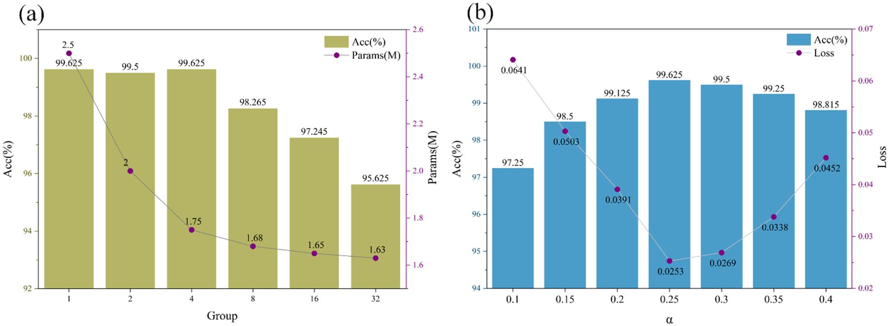 Figure 10a demonstrates the impact of group convolution configuration on model performance and complexity in grape leaf disease detection. The results reveal a critical trade-off between accuracy and parameter efficiency based on the number of groups. When increasing groups from 1 (standard convolution) to 4, the model maintains peak classification accuracy (99.625%) while reducing parameters from 2.50M to 1.75M, achieving a 30% reduction. This demonstrates that moderate grouping significantly enhances model efficiency without compromising performance, making it suitable for resource-constrained deployment environments. However, beyond 4 groups, model performance deteriorates substantially, with accuracy dropping from 99.625% to 95.625%. Excessive grouping disrupts feature interaction between channels, severely limiting the model’s representational capacity. Although parameter count further decreases to 1.63M, the accuracy loss becomes unacceptable for practical applications. Therefore, 4 groups represents the optimal configuration for this task, achieving the best balance between classification accuracy and model efficiency while maintaining practical applicability.