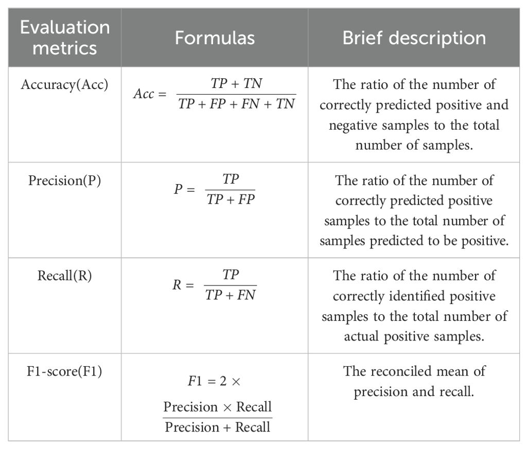 Accuracy (Acc), Precision (P), Recall (R), and F1-score (F1) are derived from the confusion matrix and serve as key metrics for evaluating the classification performance of a model. The corresponding formulas and brief descriptions of these metrics are provided in Table 2.