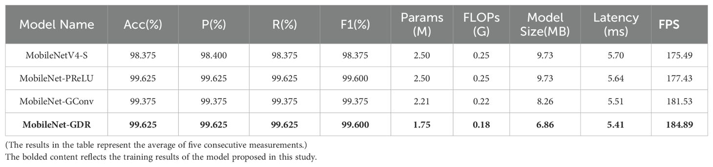 It is worth noting that after introducing group convolutions in subsequent improvements, the model accuracy experienced a slight fluctuation, with the accuracy rate dropping to 99.375%. However, the MobileNet-GDR version obtained after final optimization once again reached the top-tier level of 99.625%, and all evaluation metrics (accuracy rate, precision rate, recall rate, and F1 score) remained highly consistent, demonstrating exceptional stability. Particularly noteworthy is that these accuracy improvements were achieved on the basis of the significant optimization of model efficiency analyzed earlier, reflecting the efficiency of the MobileNet-GDR design.