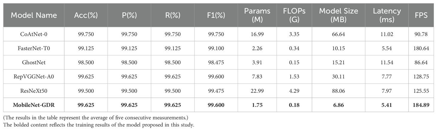 As shown in Figure 5, through an in-depth comparative analysis of the confusion matrices of the six models (CoAtNet_0 (Dai et al., 2021), FasterNet-T0 (Chen et al., 2023), GhostNet (Han et al., 2020), RepVGGNet-A0 (Ding et al., 2021), ResNeXt50 (Xie et al., 2017), and MobileNet-GDR), it can be clearly observed that the MobileNet-GDR model we proposed demonstrates outstanding classification performance. From the visual presentation of the confusion matrix, the main diagonal elements of MobileNet-GDR generally remain at a high level, indicating that the model maintains a very high degree of accuracy in identifying samples of each category. Notably, compared to other lightweight models, MobileNet-GDR achieves significantly lower off-diagonal element values while maintaining high accuracy. This feature clearly demonstrates that the model significantly reduces misclassification during the classification process, showcasing more precise discrimination capabilities. Specifically, MobileNet-GDR achieves classification accuracy rates exceeding 99% in most categories, a performance comparable to the more complex CoAtNet-0 model. Although CoAtNet-0 shows slightly better classification performance in a few fine-grained categories with small sample sizes, this advantage comes at the cost of model efficiency. Further analysis of the error distribution patterns in the confusion matrix reveals that the misclassifications generated by MobileNet-GDR are primarily concentrated between two categories with highly similar visual features. This error pattern aligns closely with human expert misjudgments, indicating that the model has learned visual discrimination capabilities approaching human levels. In contrast, the confusion matrices of other lightweight models such as GhostNet and FasterNet-T0 exhibit more dispersed error distributions, suggesting relatively weaker feature learning capabilities.