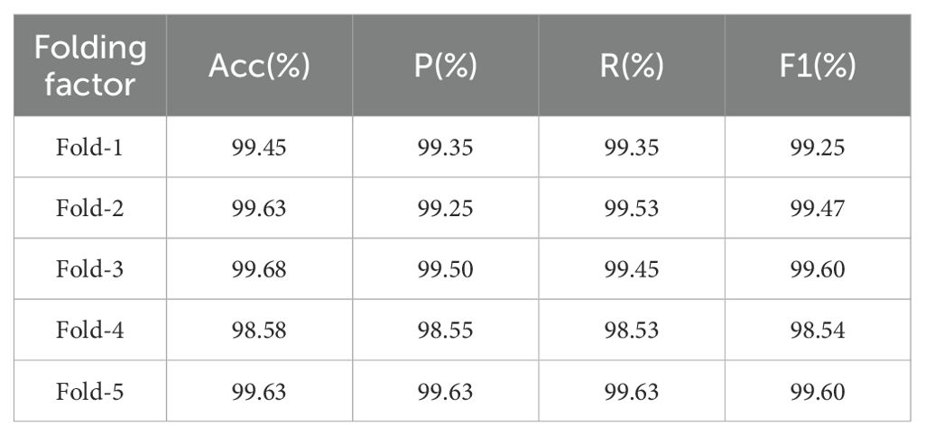 As shown in Table 5, this study comprehensively evaluated the performance of the MobileNet-GDR model in grape leaf disease detection through five-fold cross-validation. The validation results fully demonstrate the model’s outstanding classification capability and excellent generalization performance. Across four core evaluation metrics, the model achieved an average accuracy of 99.39% in five-fold validation, with average precision, recall, and F1 score reaching 99.26%, 99.30%, and 99.29%, respectively. These figures indicate the model has attained near-perfect performance levels in grape leaf disease identification.