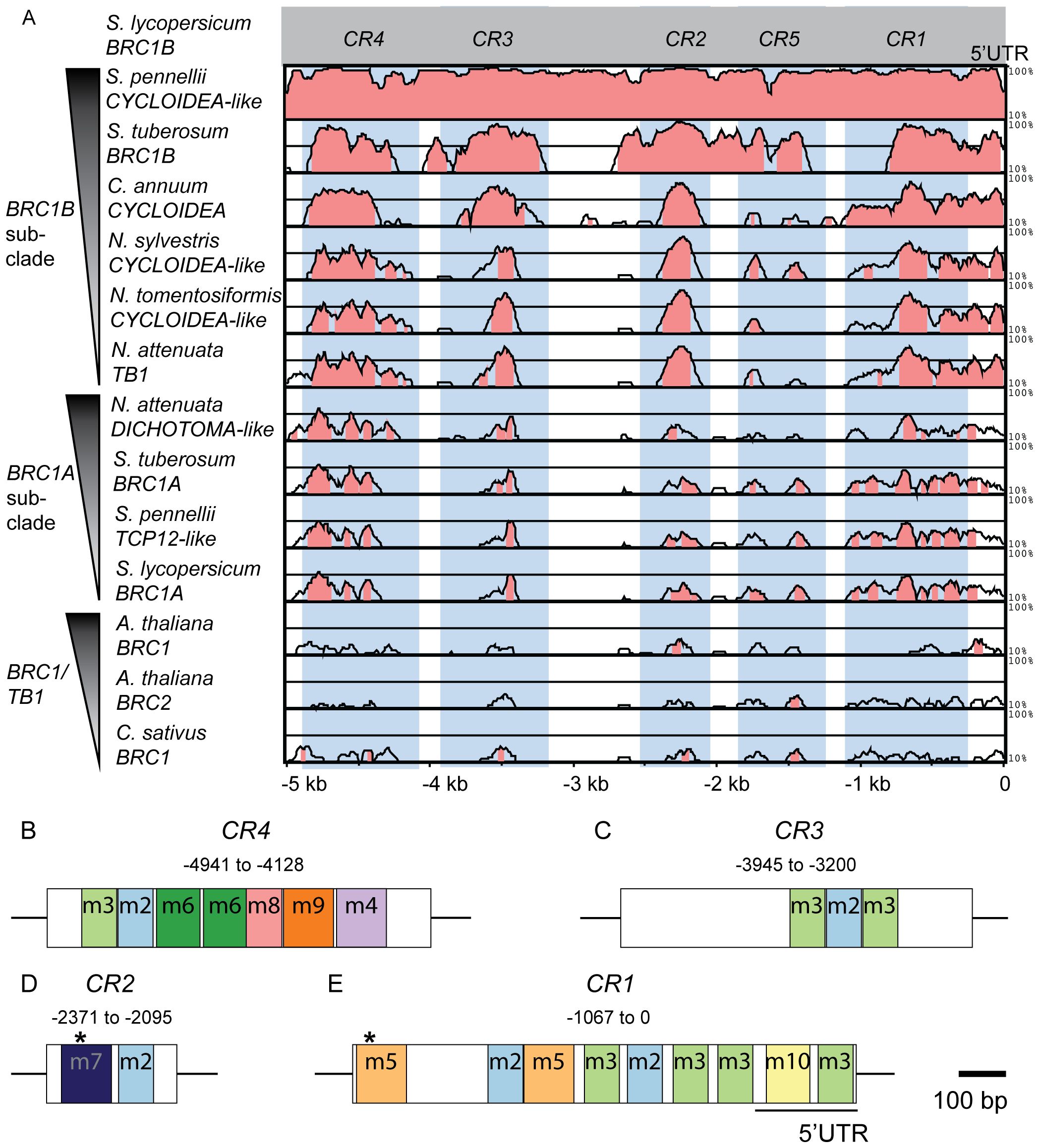 Phylogenetic tree and sequence analysis of BRC genes across various species, showing sub-clades BRC1B, BRC1A, and BRC1/TB1. Graphs depict CR regions with sequence similarities highlighted in red and blue. Diagrams B to E show specific CR elements with labeled modules. Scale bar indicates 100 base pairs.