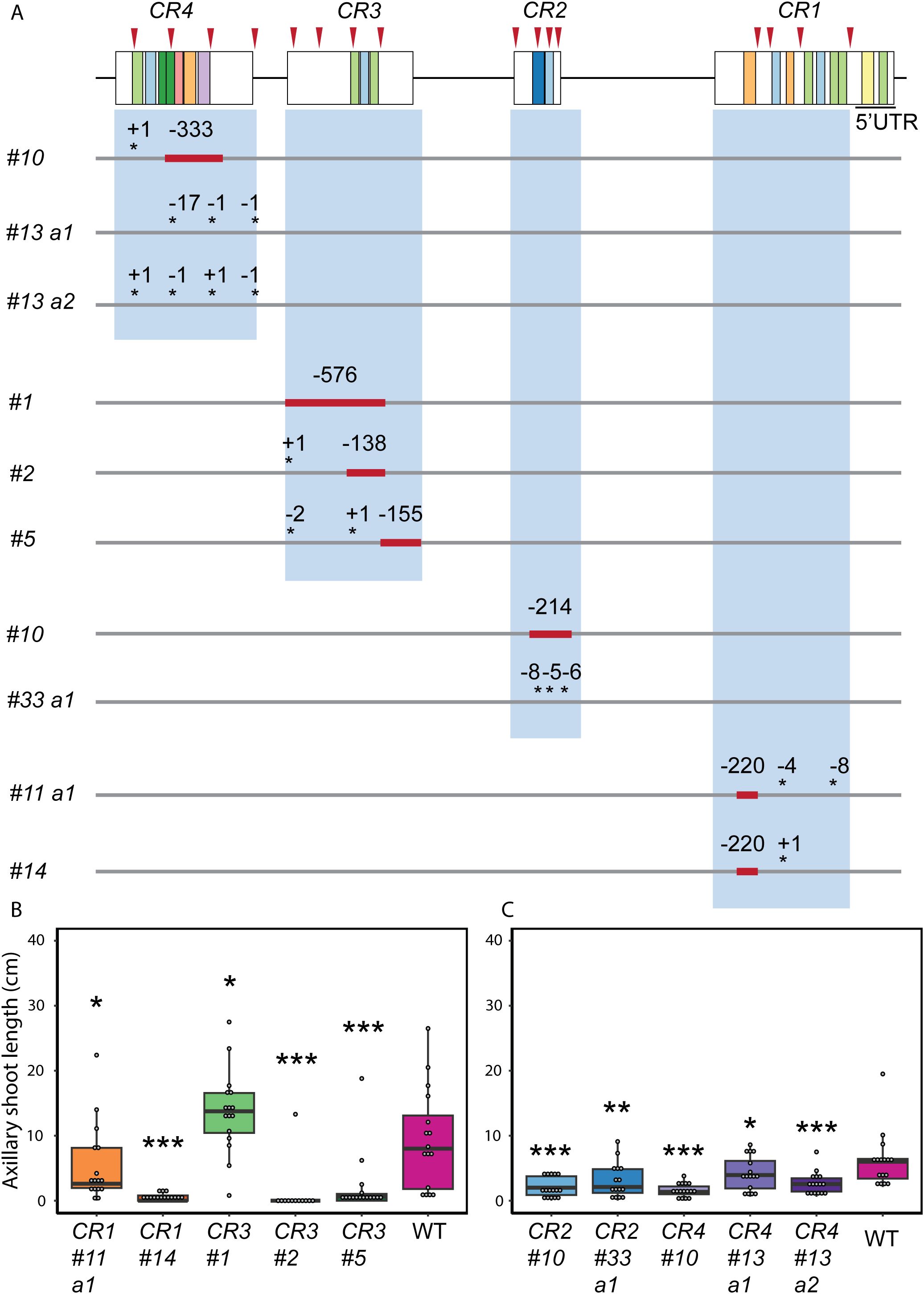 Diagram with three panels. Panel A shows gene regions CR1, CR2, CR3, and CR4 with associated mutations depicted as red bars and numbers. Panels B and C are box plots comparing axillary shoot lengths across different genotypes, with statistical significance indicated by asterisks. Panel B includes CR1 and CR3 data, while Panel C presents CR2 and CR4 data. WT indicates wild type for comparison.