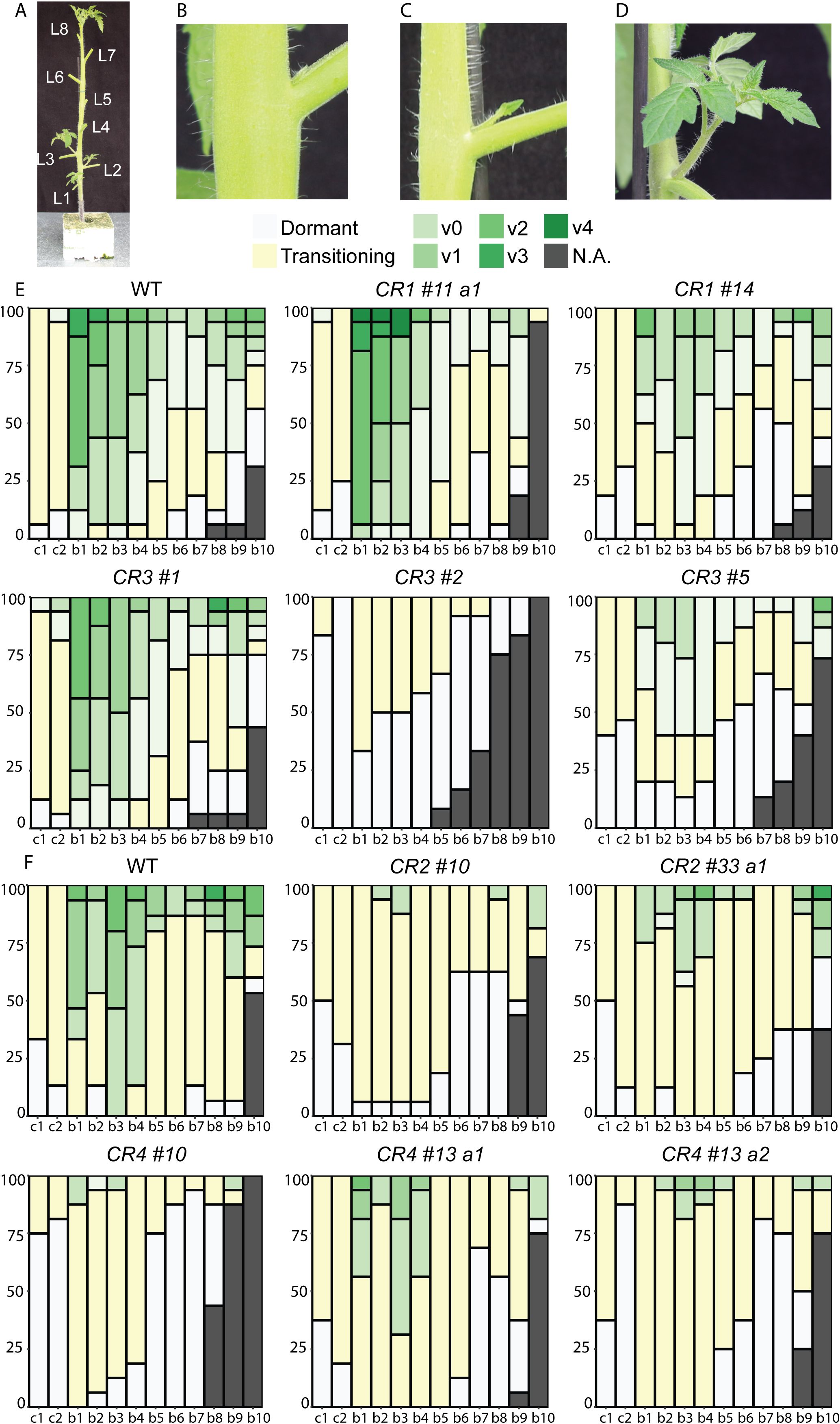Figure 3. Detailed characterization of bud outgrowth in SlBRC1B CR mutants. (A) Tomato plant with eight expanded leaves, at 6 WAS, showing the stage used for phenotyping of branching for both wild-type and mutant plants. Axillary buds and leaves were counted acropetally, and leaves were removed for clarity. (B-D) Bud development stages: a dormant bud with intact primordia (B), a transitioning bud with an elongated primordium (C), an active bud (axillary shoot longer than 0.5 cm) (D). Active buds were rated by vegetative development, where “v” stands for vegetative growth, with numbers (0, 1, 2, etc.) indicating the number of expanded leaves per shoot. (E, F) Characterization of bud or axillary shoot development in CR1 and CR3 (E), or CR2 and CR4 mutants (F) (N = 15). Stacked percentage plot showing bud outgrowth status across axil positions (cotyledons to L8). Each column represents 15 plants; the y-axis shows percentage (0–100%) and the x-axis indicates axil position. Color codes: Gray and yellow for the axillary buds (< 0.5 cm) and shades of green for the axillary shoots (> 0.5 cm). Phenotyping experiments had three independent repeats performed at different times with similar results, simultaneously for CR1 and CR3, or CR2 and CR4, respectively. WAS: weeks after sowing, b: bud, L: expanded leaf, c: cotyledon, a1/2: allele 1/2, v: vegetative, N.A., not applicable.