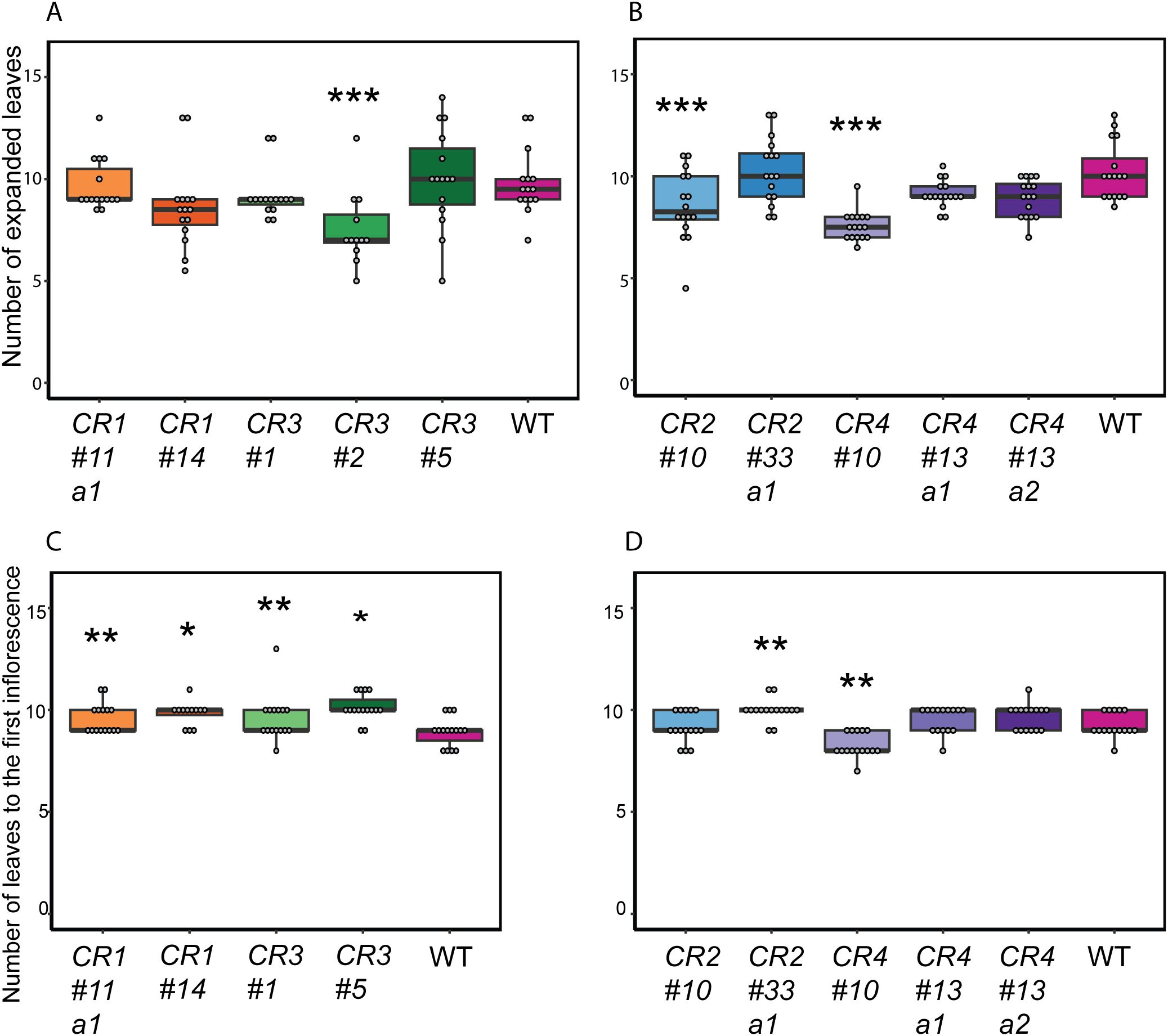 Box plots in four panels labeled A, B, C, and D compare various genotypes, including CR1, CR2, CR3, CR4, and WT, with specific line numbers. Panels A and B show the number of expanded leaves, while C and D show the number of leaves to the first inflorescence. Statistical significance is indicated by asterisks.