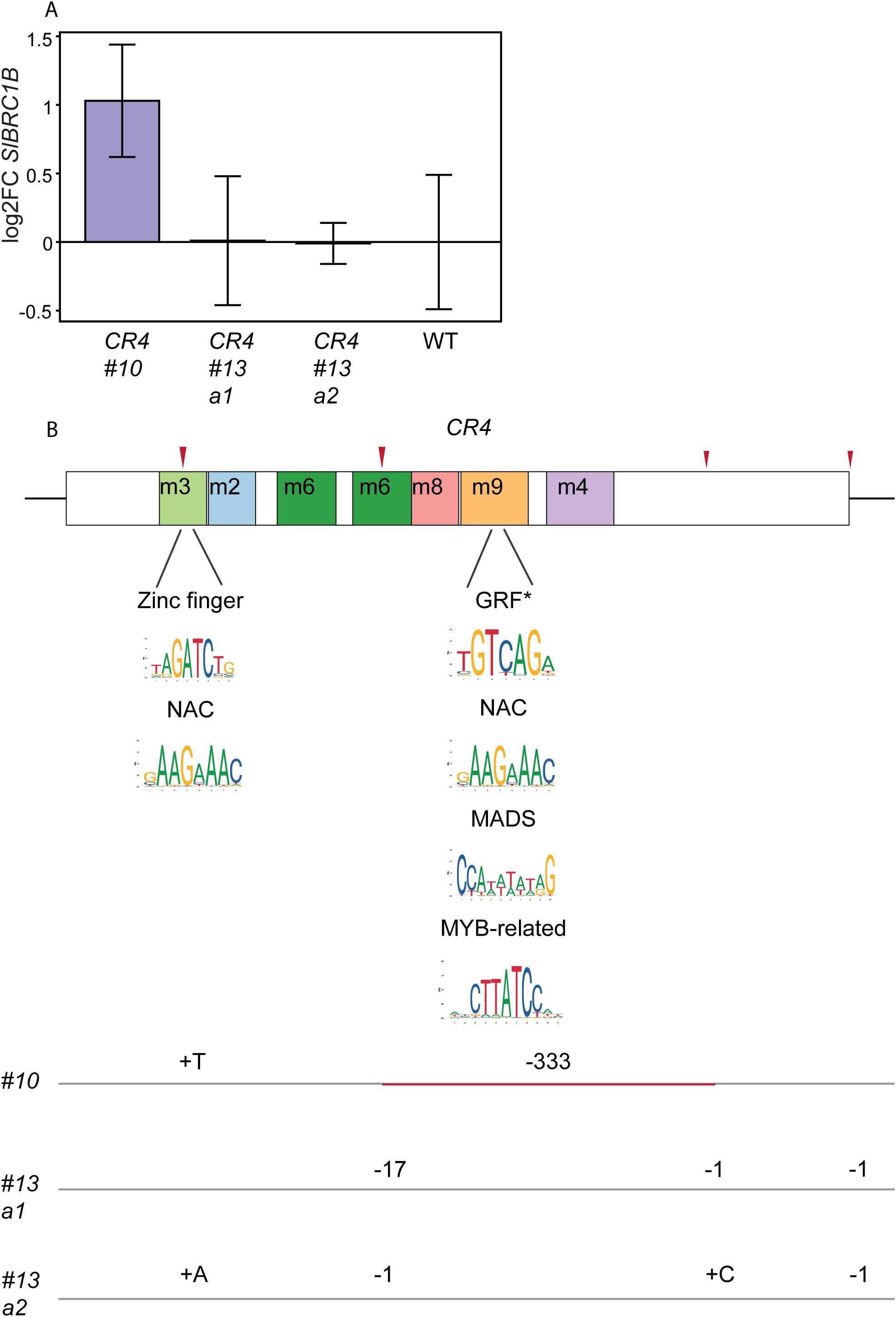 Panel A shows a bar graph of log2 fold change in SlBRC1B expression across different CR4 genotypes, with CR4 #10 having the highest expression. Panel B depicts a schematic of the CR4, highlighting zinc finger, NAC, GRF and MADS  binding sites with associated motifs. Below, sequences indicate specific nucleotide changes for each genotype (#10, #13 a1, #13 a2).