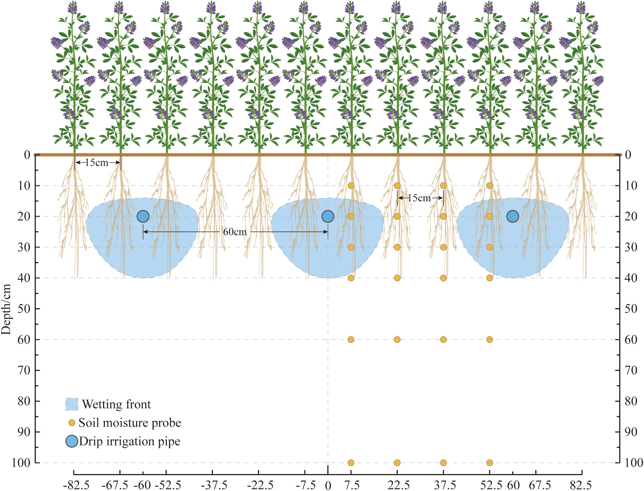 Within each plot, four vertical arrays of soil moisture sensors were installed in the inter-row spaces between alfalfa rows serviced by two adjacent drip tapes. Sensors were placed at depths of 10, 20, 30, 40, 60, and 100 cm, totaling 24 automated probes per treatment plot (Figure 2). Volumetric soil water content was recorded at 5-minute intervals using an automated monitoring system.