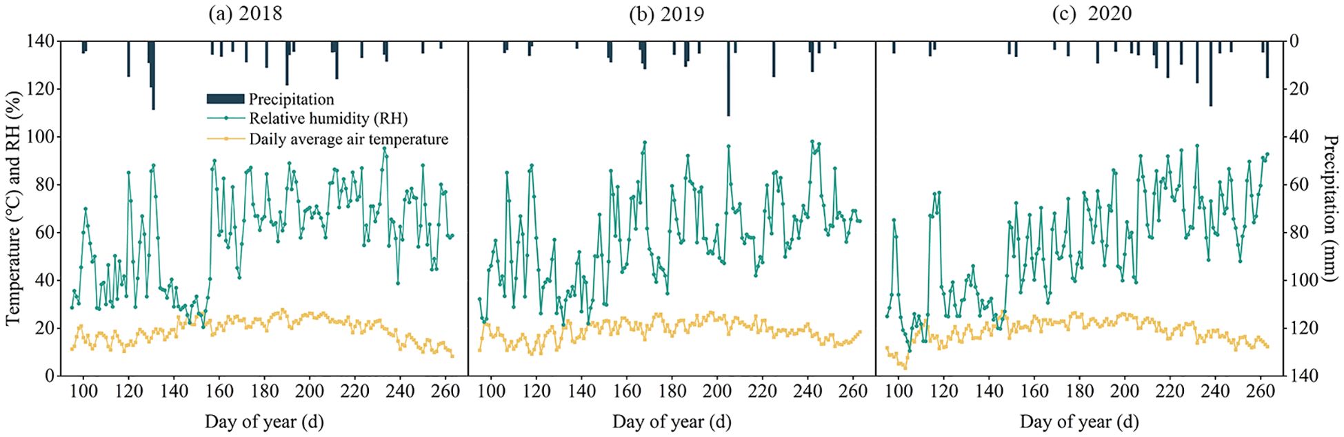 Meteorological parameters including daily air temperature, precipitation, wind speed, relative humidity, atmospheric pressure, and wind direction were monitored throughout the experimental period (2018-2020) using an automated weather station (HOBO U30, Onset Computer Corporation, USA) installed at the site. Growing season precipitation measured 207.86 mm (2018), 177.70 mm (2019), and 183.50 mm (2020), representing 79.8%, 68.2%, and 70.5% of respective annual totals. As showed in Figure 3.