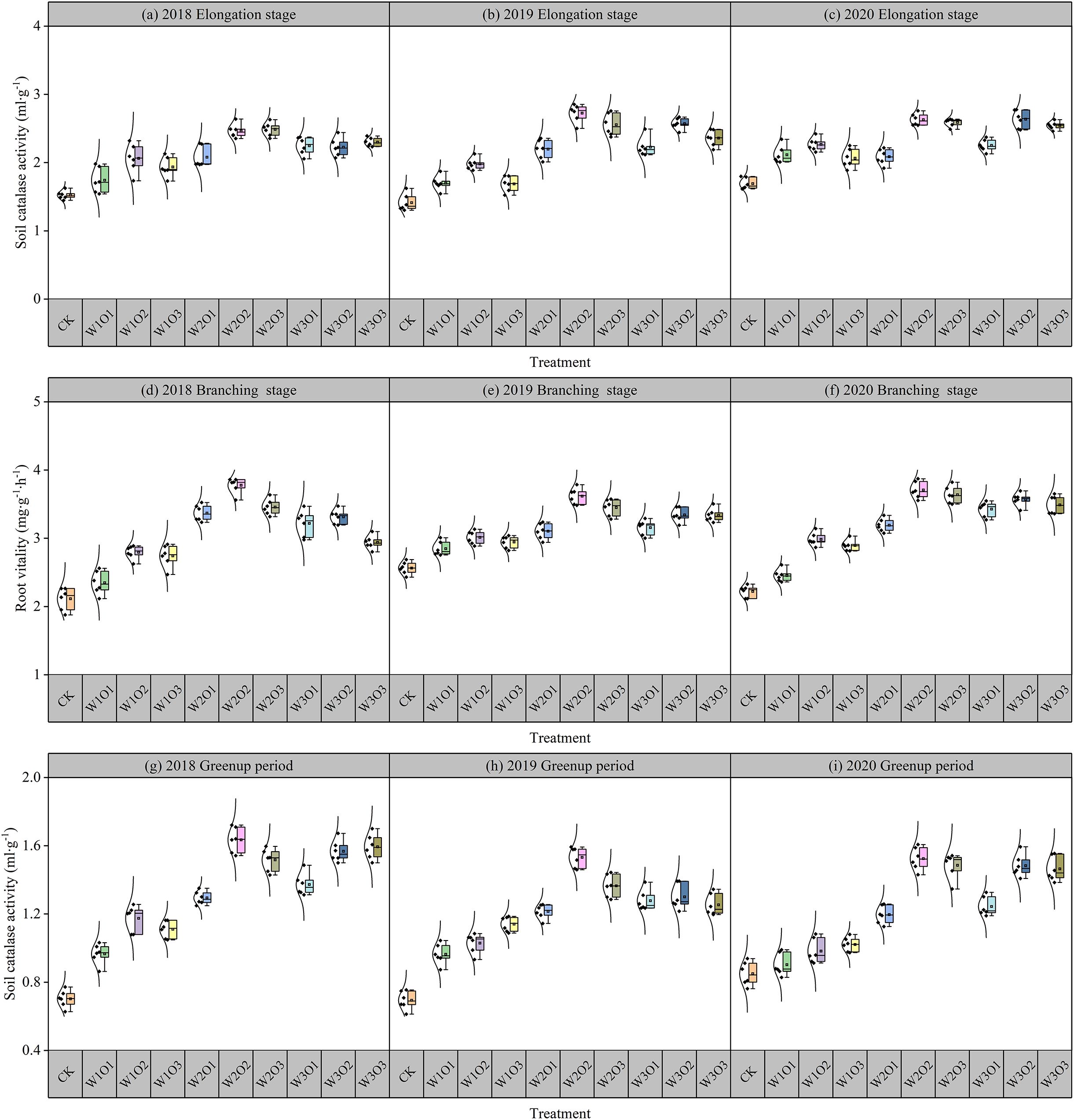 As illustrated in Figure 7, plant height of alfalfa during the flowering period from 2018 to 2020. Overall, the nine datasets exhibited generally consistent trends. No significant difference (P > 0.05) was observed between the control and the W1O1 treatment, though plant height in both was moderately lower than that in the W1O2 and W1O3 treatments. As the irrigation volume increased to medium (W2) and high (W3) levels, plant height showed a significant increase with increasing irrigation amount (P <0.05). Under the same irrigation level, plant height initially increased significantly with rising dissolved oxygen (DO) concentration. However, the plant height under the O3 treatment was either slightly lower than or not significantly different from that under O2, suggesting the existence of a DO threshold beyond which oxygen no longer acts as a limiting factor for plant height, and excessive DO may even inhibit root nutrient uptake efficiency. Therefore, it can be preliminarily concluded that irrigation volume has a greater influence on plant height than dissolved oxygen concentration, with irrigation amount being the dominant factor governing plant height growth.