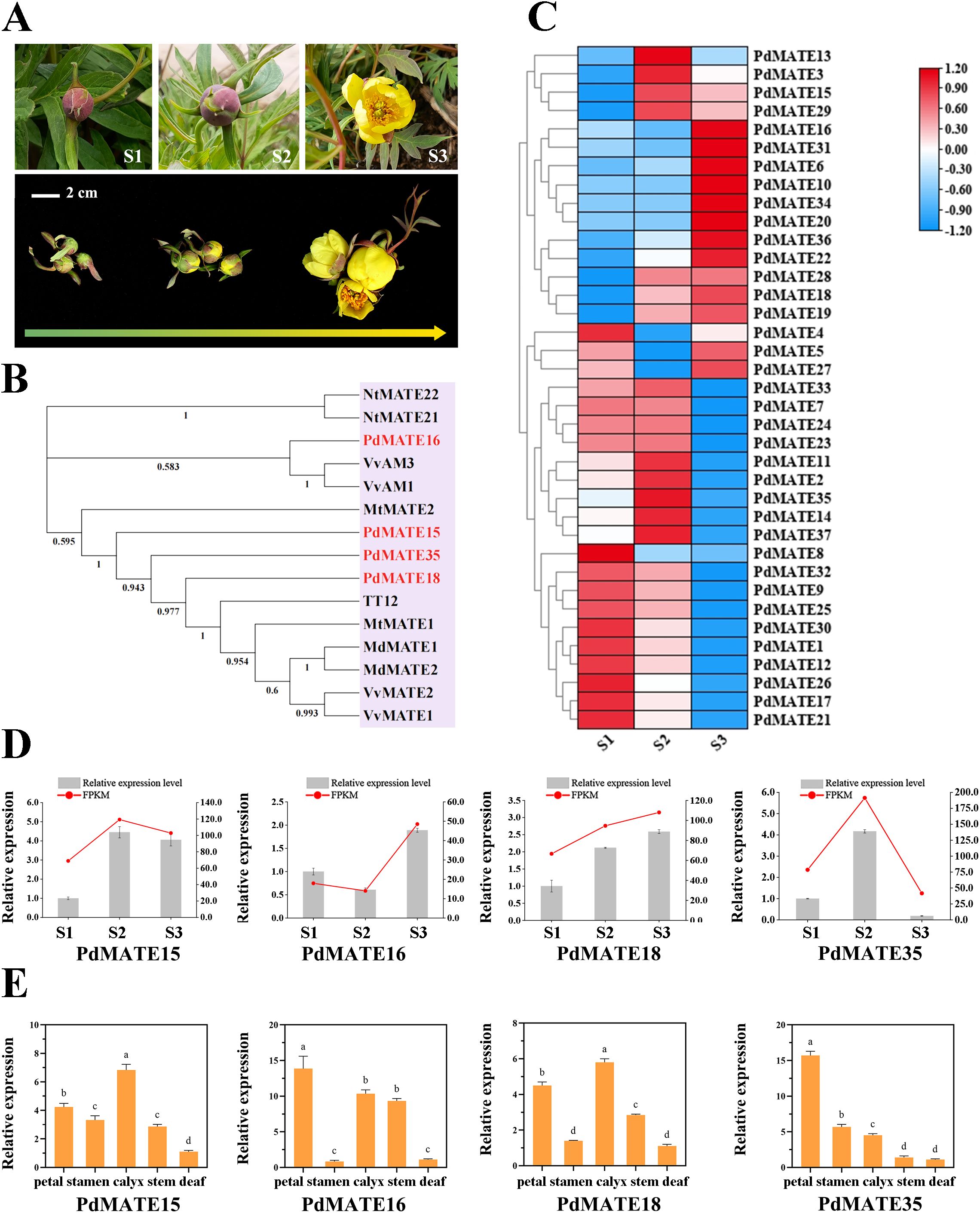 Figure 1. Identification and screening of transporter flavonoid MATE in P. delavayi var. lutea. (A) Petal phenotypes of P. delavayi var. lutea at three flowering stages. S1: Immature tight bud; S2: mature flower at the closed-bud stage; S3: fully opened flower. Bar = 2 cm. (B) Phylogenetic tree was constructed using the neighbor-joining method of PdMATE with identified flavonoid-related MATEs from other plants. (C) Expression pattern analysis of PdMATE gene family members in different flower developmental processes. (D) The expression profiles of five PdMATE genes in different developmental stages of P. delavayi var. lutea were analyzed using qRT-PCR. (E) The expression profiles of five PdMATE genes in different P. delavayi var. lutea tissues were analyzed by qRT-PCR. An asterisk indicates a significant difference. Different letters indicate significant differences (P < 0.05).