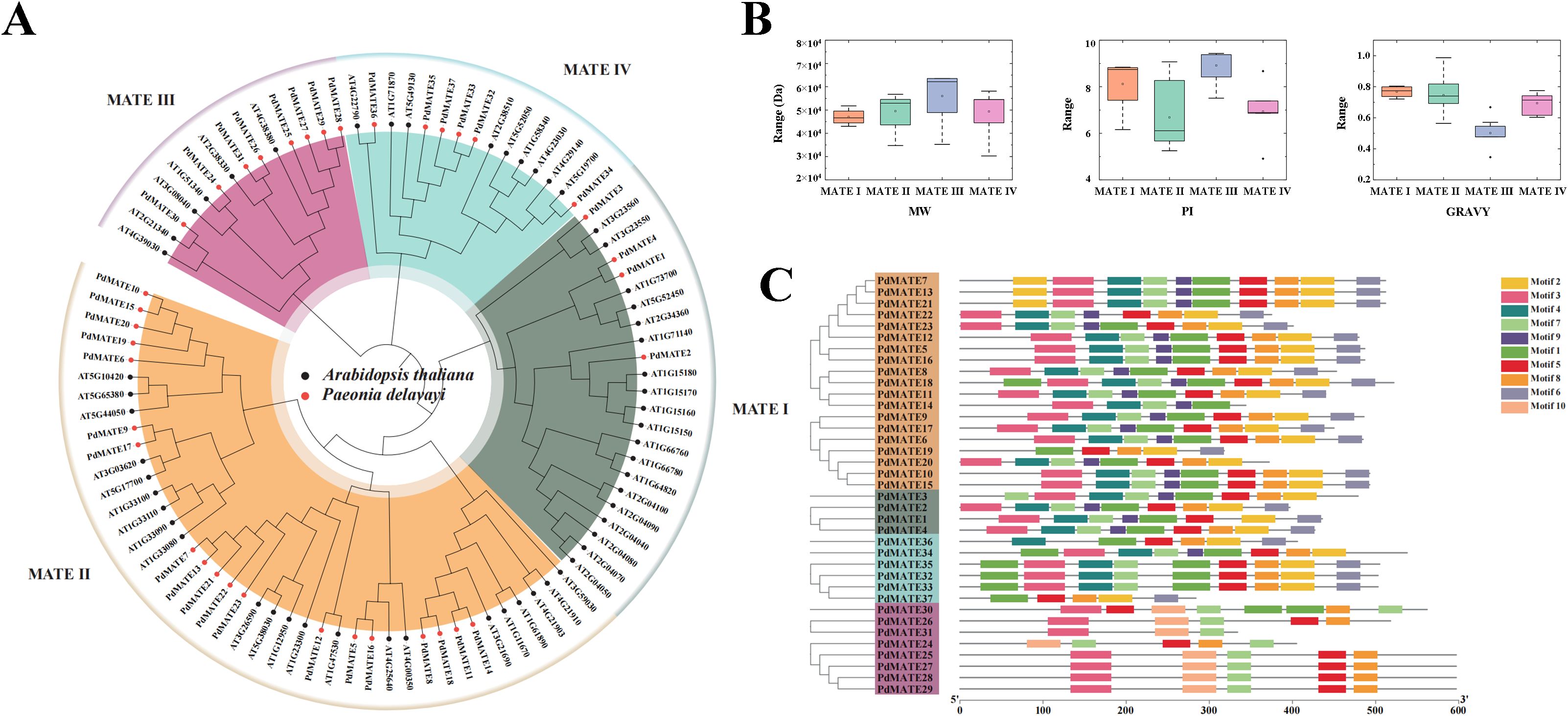 Figure 2. Identification and phylogenetic analysis of PdMATE. (A) Phylogenetic analysis of PdMATE proteins. (B) Visualization of physicochemical properties of members of PdMATE on a subfamily basis. (C) Schematic representation of the phylogenetic relationships and conserved motifs analysis in PdMATE proteins.