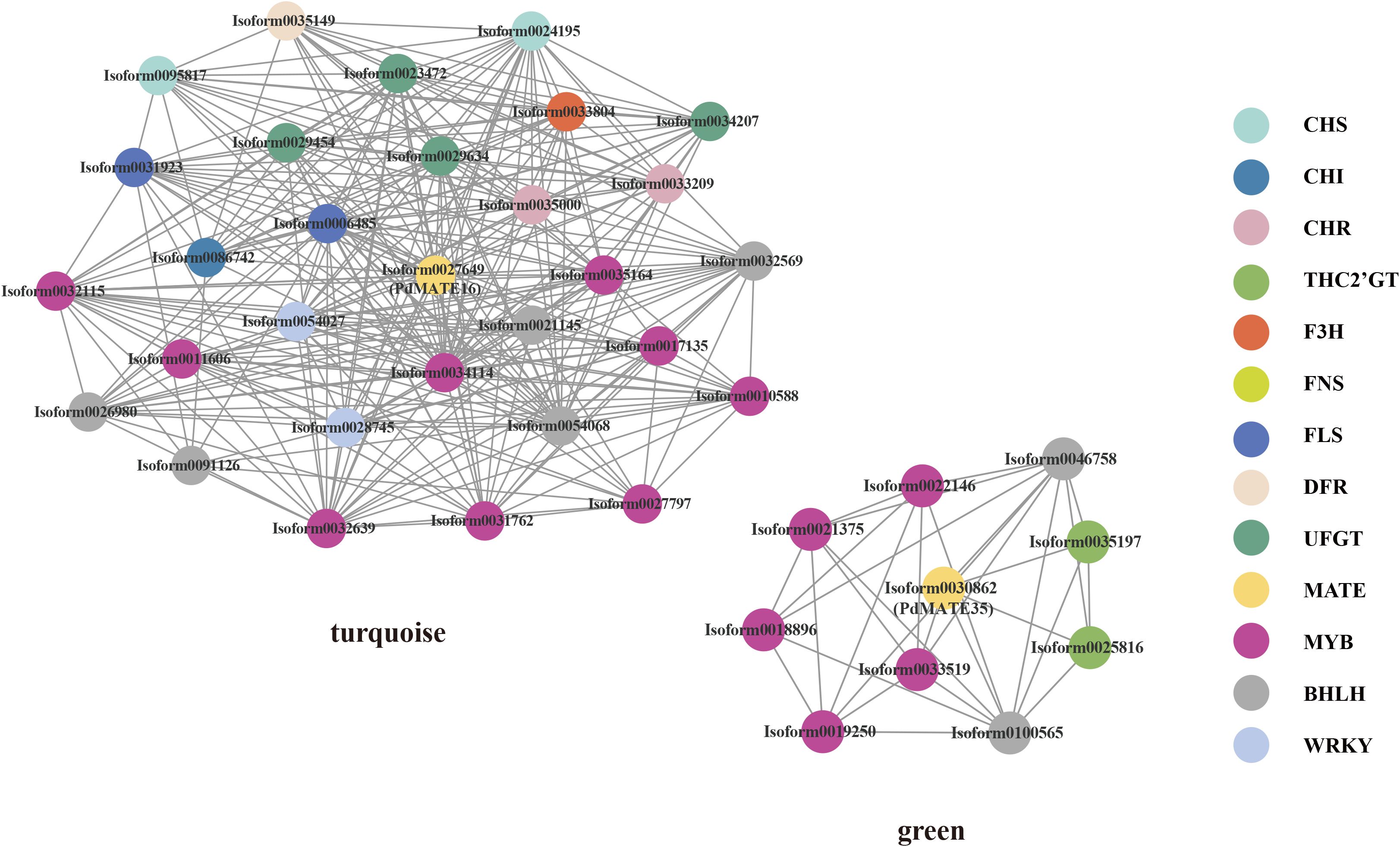Figure 3. Co-expression network represents the relationships between PdMATEs and possible transcription factors predicted by WGCNA methods. Different colors represent different genes.