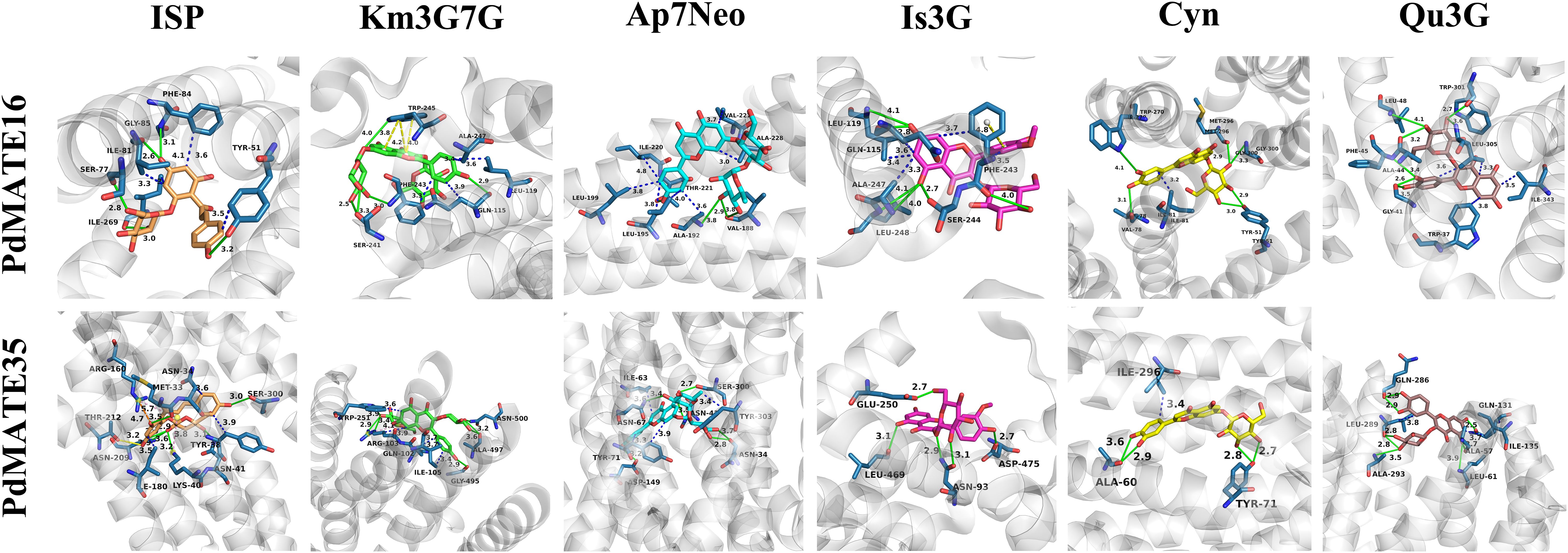 Figure 4. Molecular docking analysis of PdMATE16 and PdMATE35 with flavonoid compounds. Solid green lines show hydrogen-bonding interactions; salt-bridge interactions are shown by dashed yellow lines; π-Cation interactions are shown by dashed blue lines. ISP: isosalipurposide; Km3G7G: kaempferol 3,7-di-O-glucoside; Ap7Neo: apigenin 7-O-neohesperidoside; Is3G: isorhamnetin 3-O-glucoside; Cyn: cynaroside; Qu3G: quercetin 3-O-galloylglucoside.