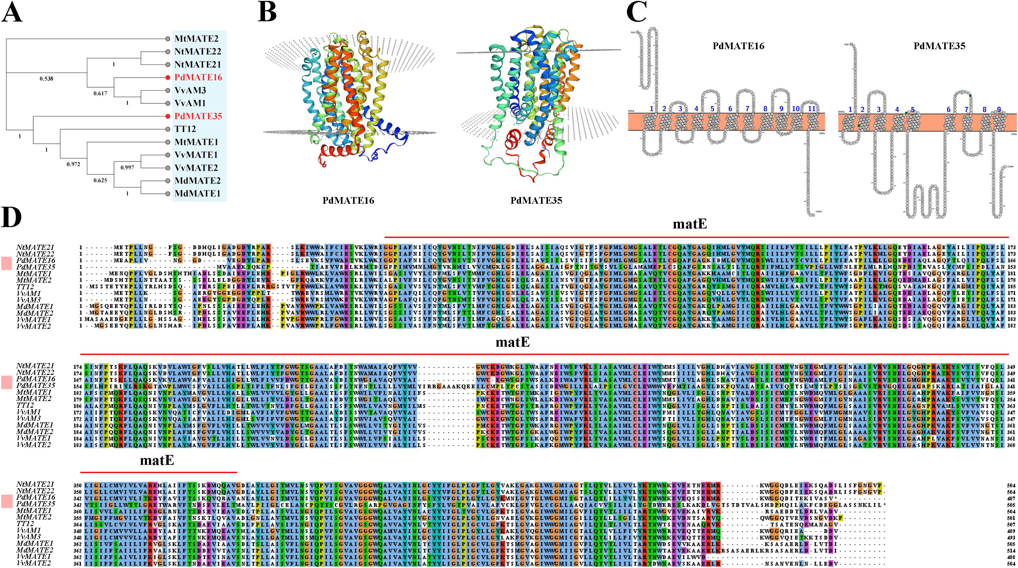 Figure 5. Cloning and sequence analysis of candidate PdMATE genes. (A) Phylogenetic tree of PdMATE16 and PdMATE35 with other identified flavonoid-related MATEs in plants was constructed using the neighbor-joining method. (B) Protein 3D structure of PdMATE16 and PdMATE35. (C) Predicted transmembrane helical structures of PdMATE16 and PdMATE35; 1–11 indicates the number of transmembrane helices of PdMATE. (D) Multiple comparisons of the amino acid sequence of PdMATEs with their homologs. Different colors represent different identities.