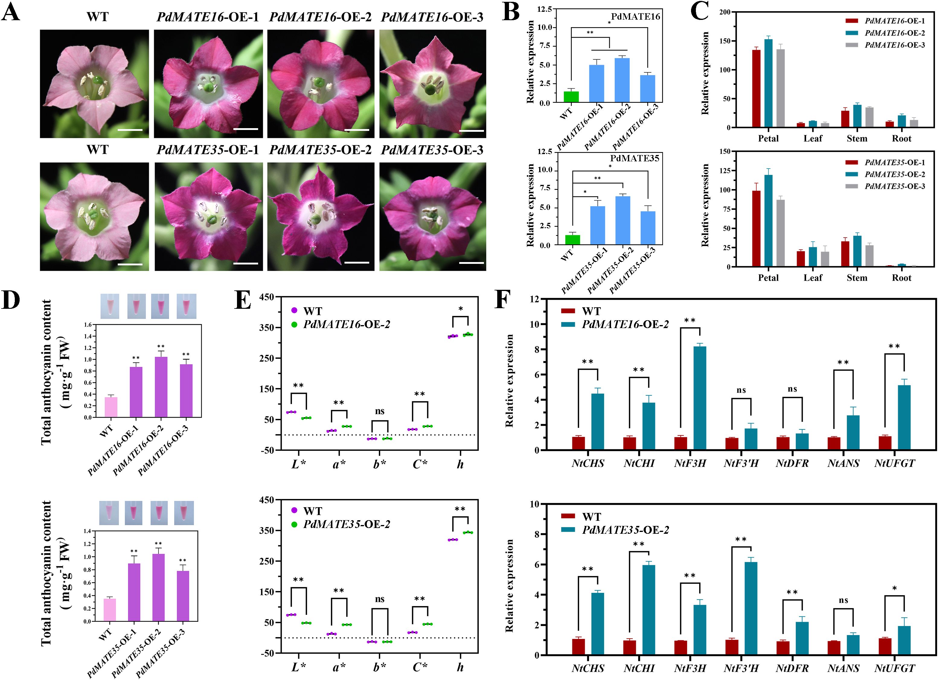 Figure 6. Effects of overexpression of PdMATE16 and PdMATE35 in tobacco. (A) Wild-type (WT) and overexpression of PdMATE16 and PdMATE35 in tobacco petals phenotypes. Bar = 2 cm. (B) The results of qRT-PCR detection in transgenic tobacco lines. (C) Temporal and spatial expression patterns of PdMATE16 and PdMATE35 in the three transgenic tobacco lines. (D) Total anthocyanin content was determined in petals of overexpression strains. (E) Over-represents the color index of the strain. L* denotes brightness. a* and b* denote red and yellow, respectively. C* denotes chromaticity. h denotes hue angle. (F) Expression patterns of endogenous tobacco genes in petals of WT and transgenic tobacco plants. Error lines indicate standard deviation in three biological replicates. Asterisks in (B–D, F) indicate significant differences. (Student’s t-test, *P < 0.05, **P < 0.01.).