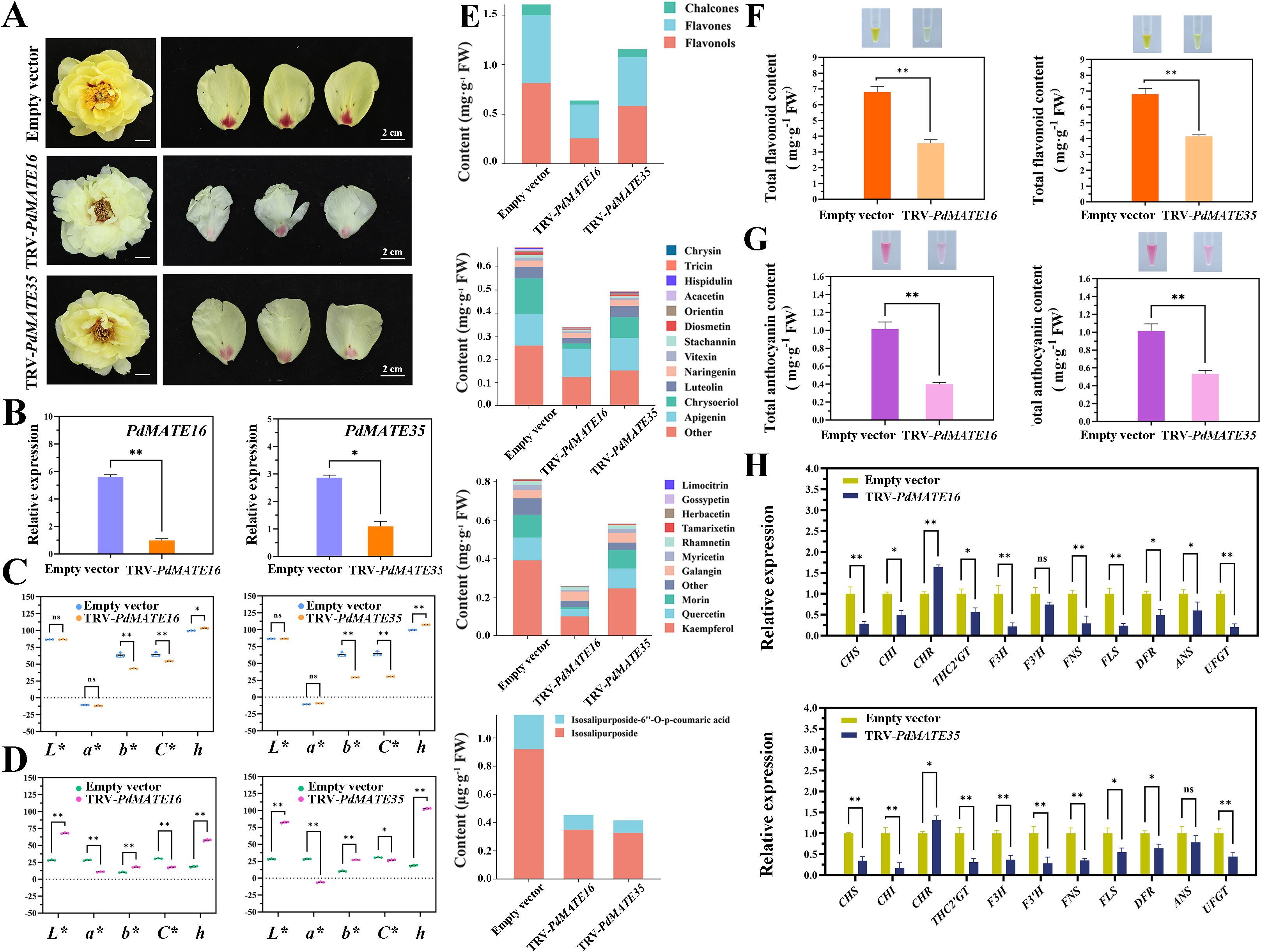 Figure 7. Effects of silencing of TRV empty vector, TRV-PdMATE16 and TRV-PdMATE35 in ‘High Noon.’ (A) Phenotypic observation of ‘High Noon’ peony petals after silencing TRV empty vector, TRV-PdMATE16 and TRV-PdMATE35. Bar = 2 cm. (B) qRT-PCR detection results in silenced petals. (C) Color indices of petal regions after silencing TRV empty vector, TRV-PdMATE16 and TRV-PdMATE35. L* denotes brightness. a* and b* denote red and yellow, respectively. C* denotes chromaticity. h denotes hue angle. (D) Color indices of the floral patch region after silencing TRV empty vector, TRV-PdMATE16 and TRV-PdMATE35. (E) Trends of the contents of different flavonoid compounds in petals after silencing TRV empty vector, TRV-PdMATE16 and TRV-PdMATE35. (F) Determination of total flavonoid content in petals after silencing TRV empty vector, TRV-PdMATE16 and TRV-PdMATE35. (G) Determination of total anthocyanin content in the floral patch region after silencing TRV empty vector, TRV-PdMATE16 and TRV-PdMATE35. (H) Expression patterns of structural genes and candidate transcription factors on the flavonoid synthesis pathway in petals after silencing TRV empty vector, TRV-PdMATE16 and TRV-PdMATE35. Error lines indicate standard deviations in three biological replicates. Asterisks in (A, C, D) indicate significant differences. (Student’s t-test, *P < 0.05, **P < 0.01.).
