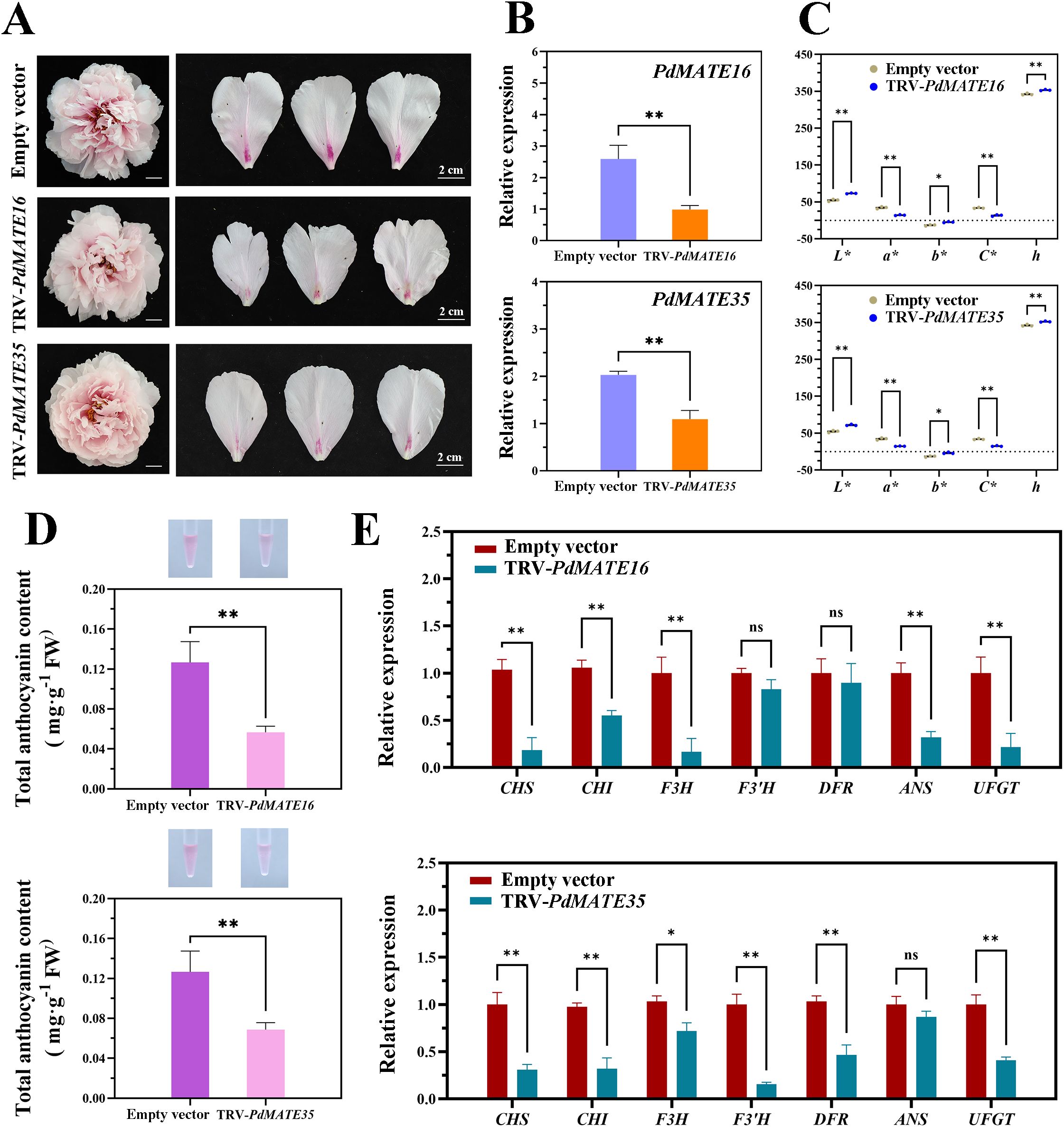 Figure 8. Effects of silencing of TRV empty vector, TRV-PdMATE16 and TRV-PdMATE35 in ‘Xue Ying Tao Hua.’ (A) Phenotypic observations of ‘Xue Ying Tao Hua’ peony petals after silencing TRV empty vector, TRV-PdMATE16 and TRV-PdMATE35. Bar = 2 cm. (B) qRT-PCR -PCR detection results in silenced petals. (C) Color indices of the blotchy areas after silencing TRV empty vector, TRV-PdMATE16 and TRV-PdMATE35. L* denotes luminance. a* and b* denote red and yellow, respectively. C* denotes chromaticity. h denotes the hue angle. (D) Determination of total anthocyanin content in the blotchy areas after silencing TRV empty vector, TRV-PdMATE16 and TRV-PdMATE35. (E) Expression patterns of structural genes and transcription factors on the flavonoid synthesis pathway in petals silenced for TRV empty vector, TRV-PdMATE16 and TRV-PdMATE35. Error lines indicate standard deviation in three biological replicates. Asterisks in (B–E) indicate significant differences. (Student’s t-test, *P < 0.05, **P < 0.01.).